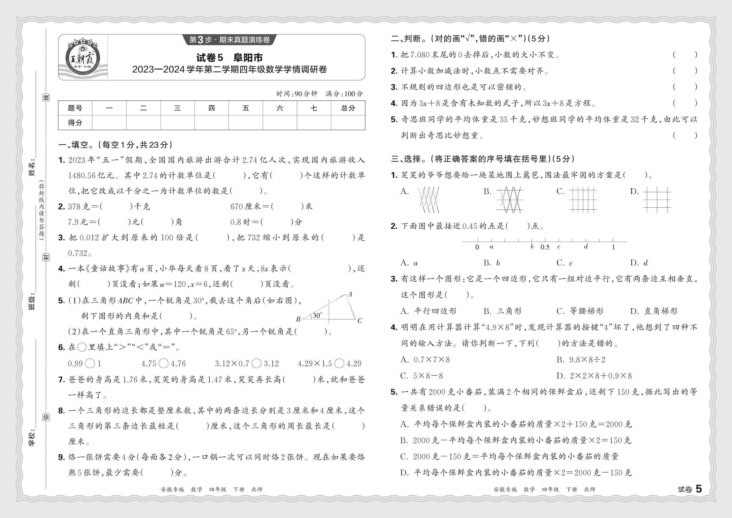 安徽省阜阳市2023—2024学年度第二学期四年级数学学情调研卷(北师版)【5】