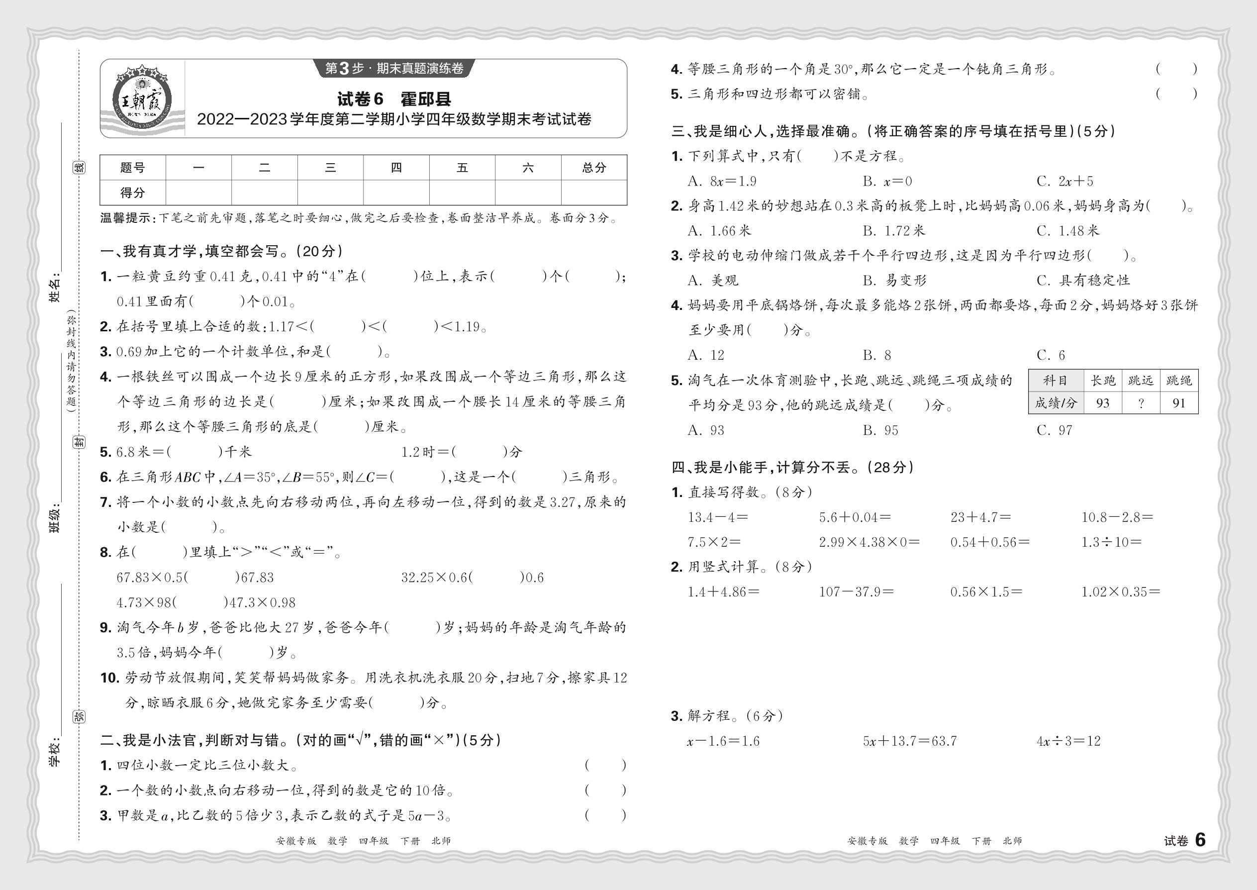 安徽省六安市霍邱县2022—2023学年度第二学期小学四年级数学期末考试试卷(北师版)【6】