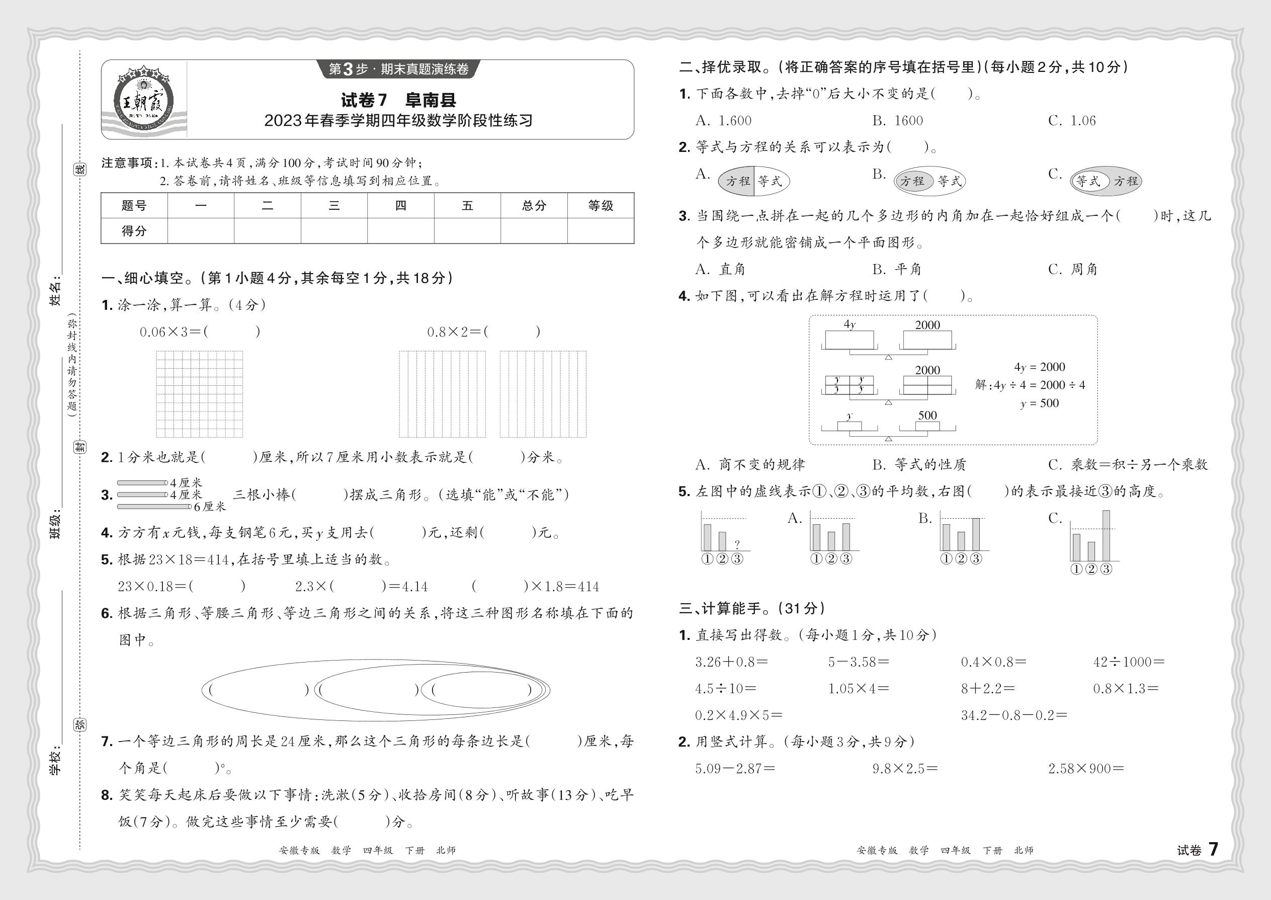 安徽省阜阳市阜南县2023年春季学期四年级数学阶段性练习(北师版)【7】