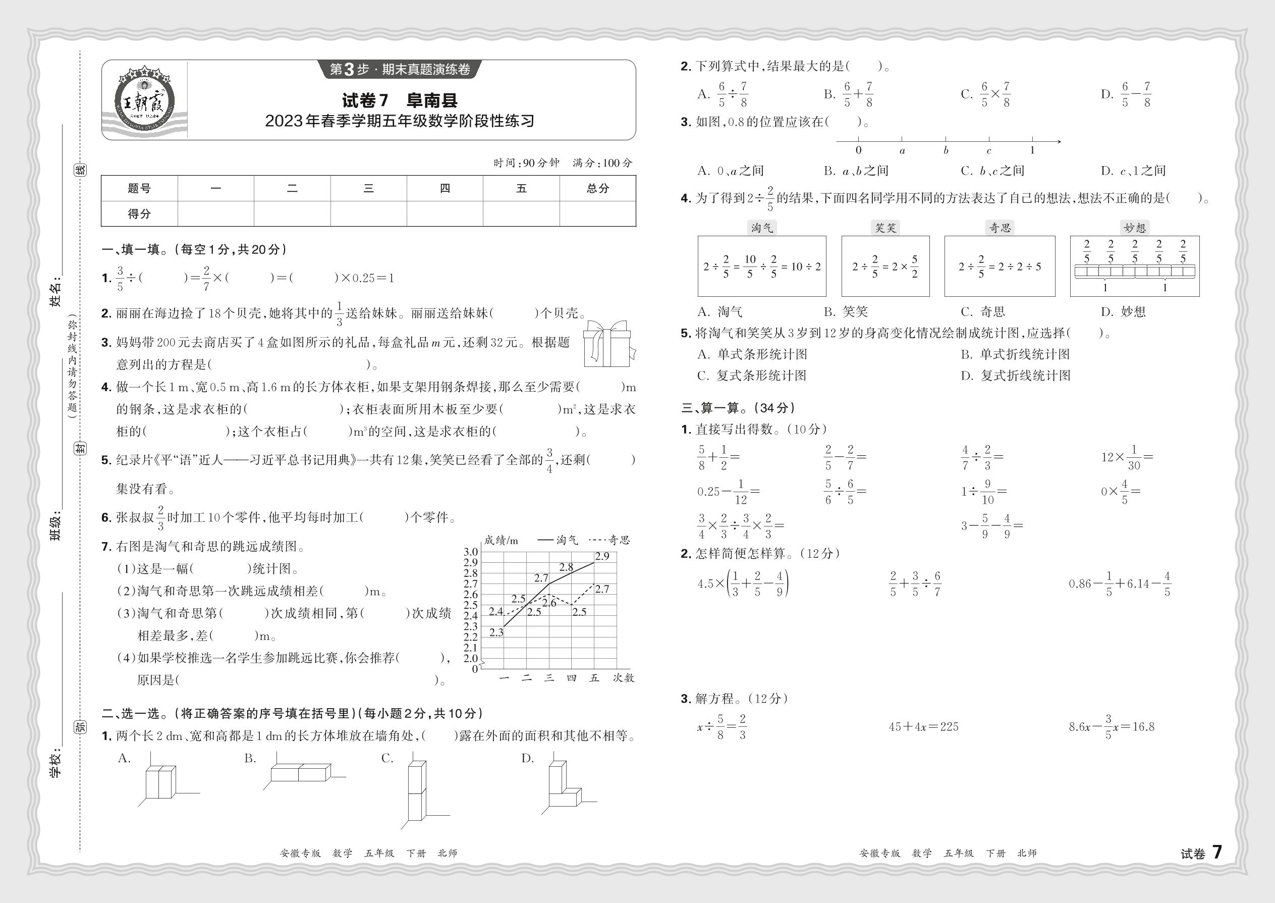 安徽省阜阳市阜南县2023年春季学期五年级数学阶段性练习(北师版)【7】