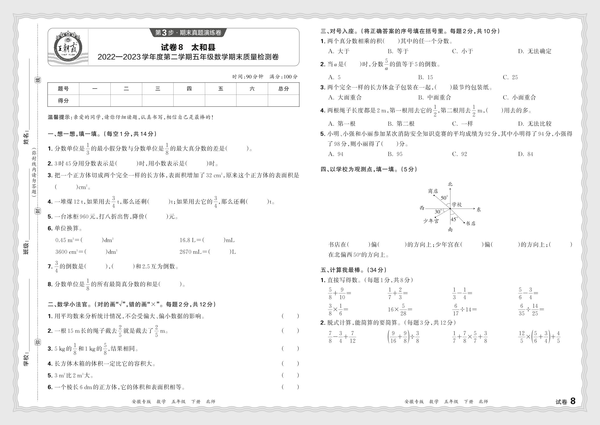 安徽省阜阳市太和县2022—2023学年度第二学期五年级数学期末质量检测卷(北师版)【8】