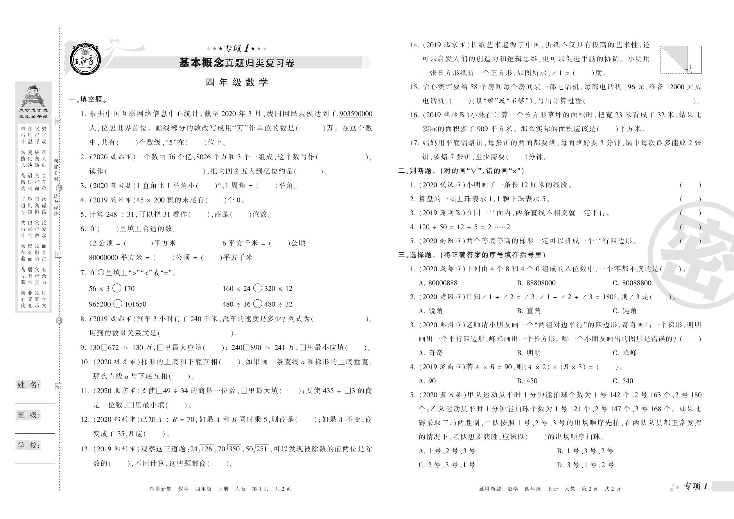 王朝霞期末专项卷——基本概念、计算真题归类复习四年级上册数学(人教版)_R210804140024【0】