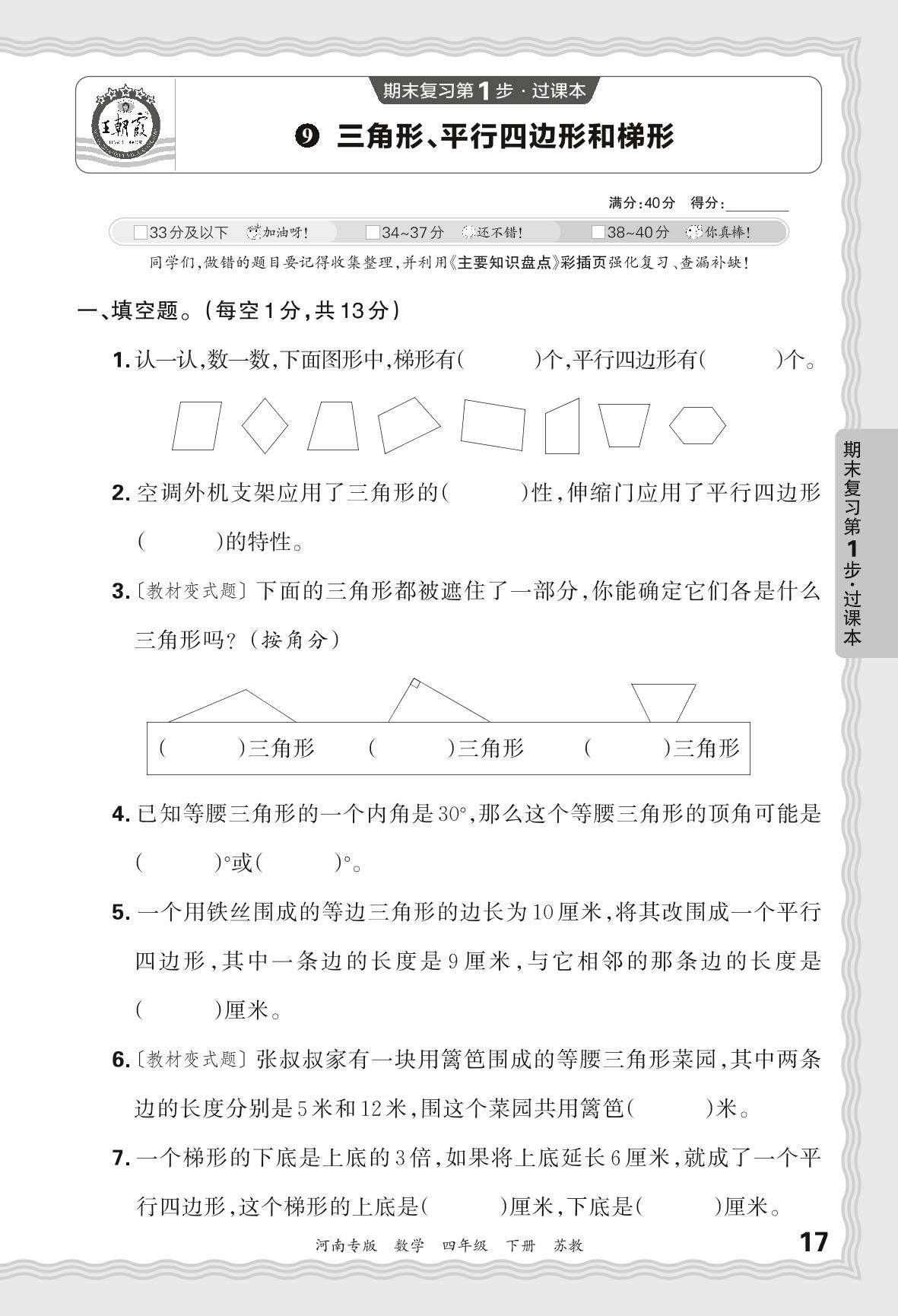 2024春下册四年级数学苏教版 期末过课本河南版·三角形、平行四边形和梯形【9】