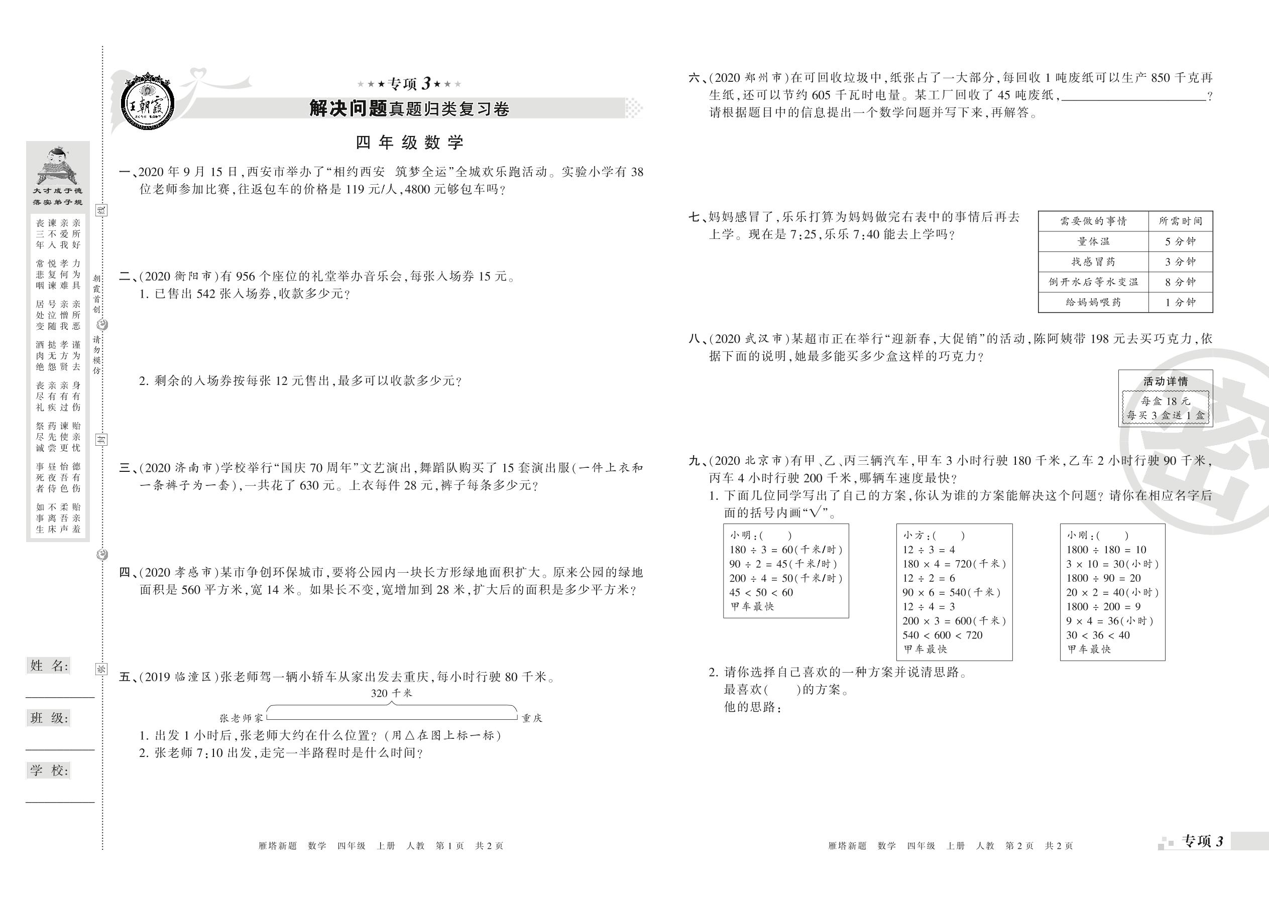王朝霞期末专项卷——解决问题真题归类复习、新颖题速递:生活与数学四年级上册数学(人教版)_R210804140027【0】