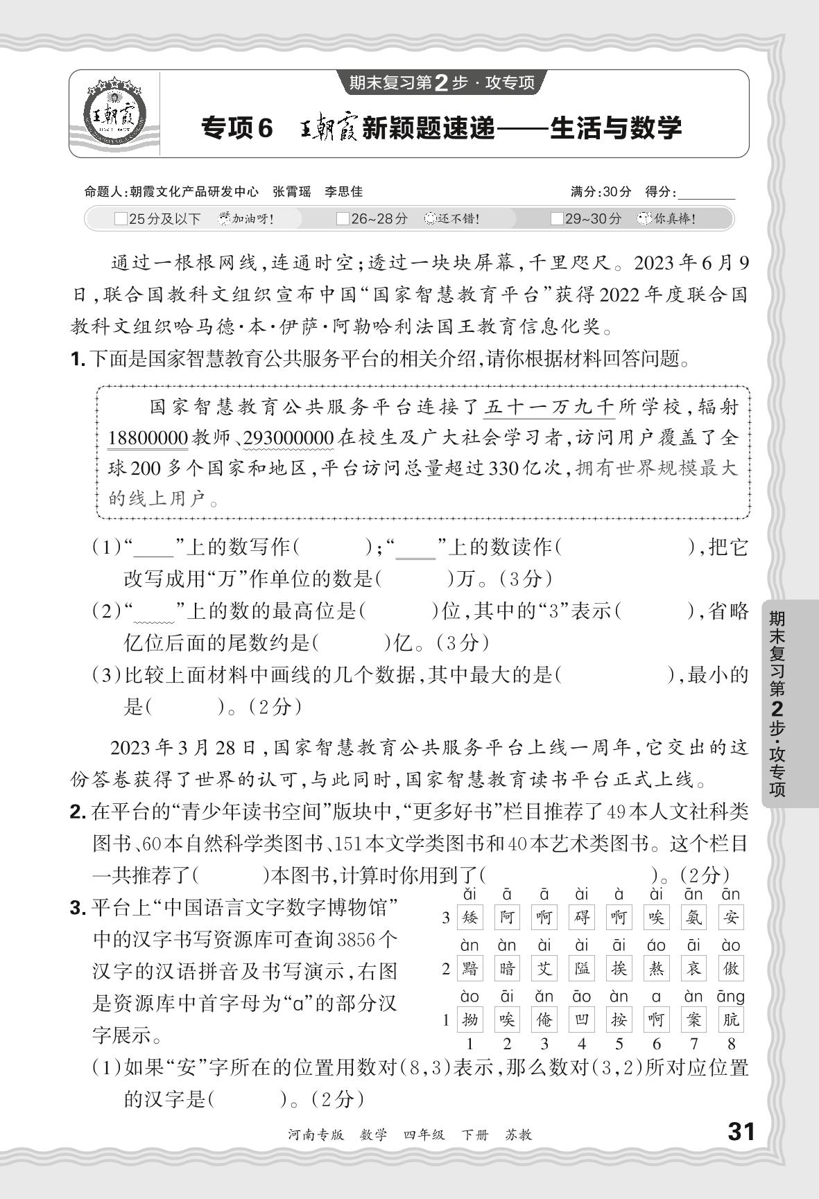 2024春下册四年级数学苏教版 期末专项卷河南版·王朝霞新颖题速递——生活与数学【6】