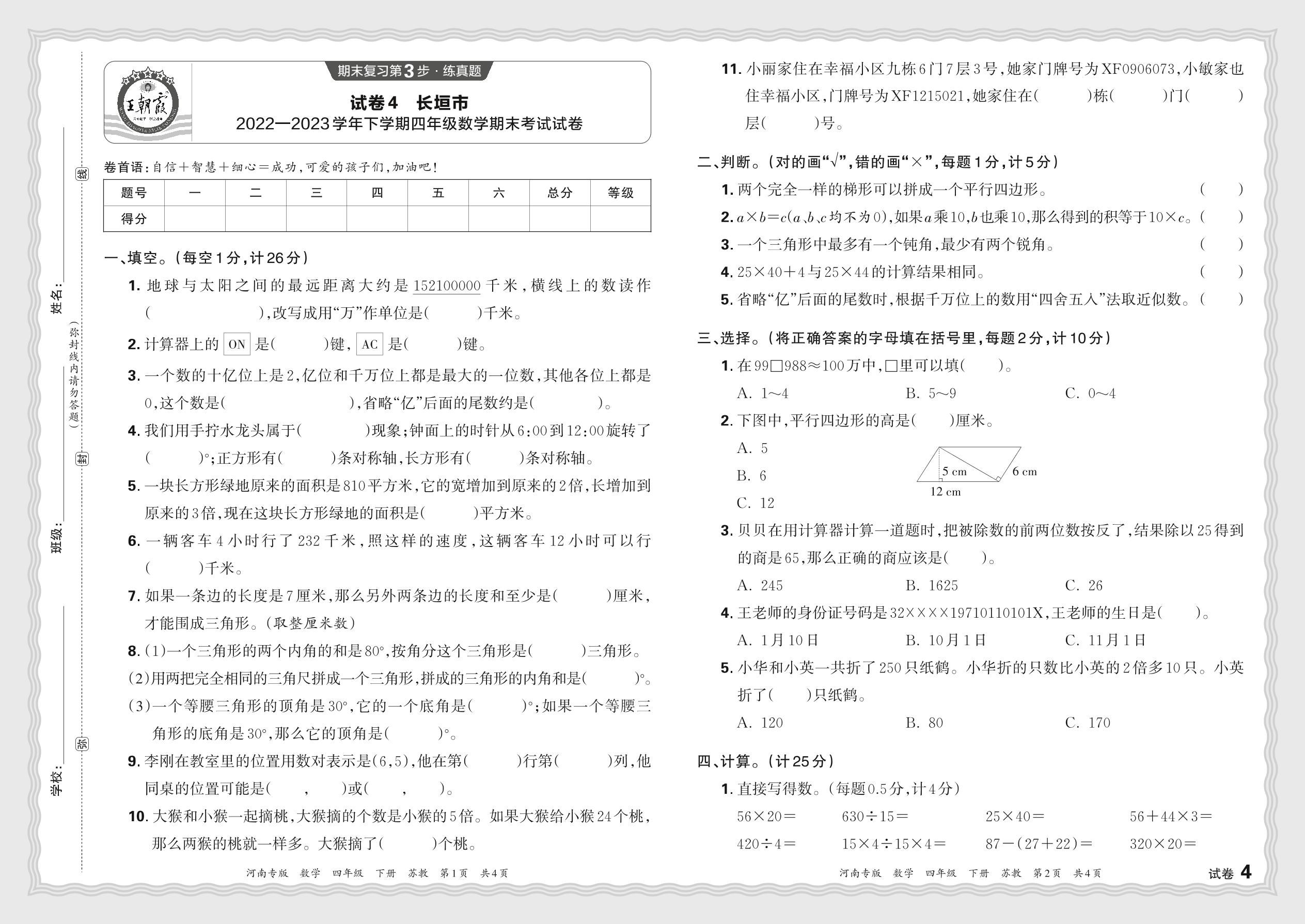 四年级数学苏教版下册期末卷