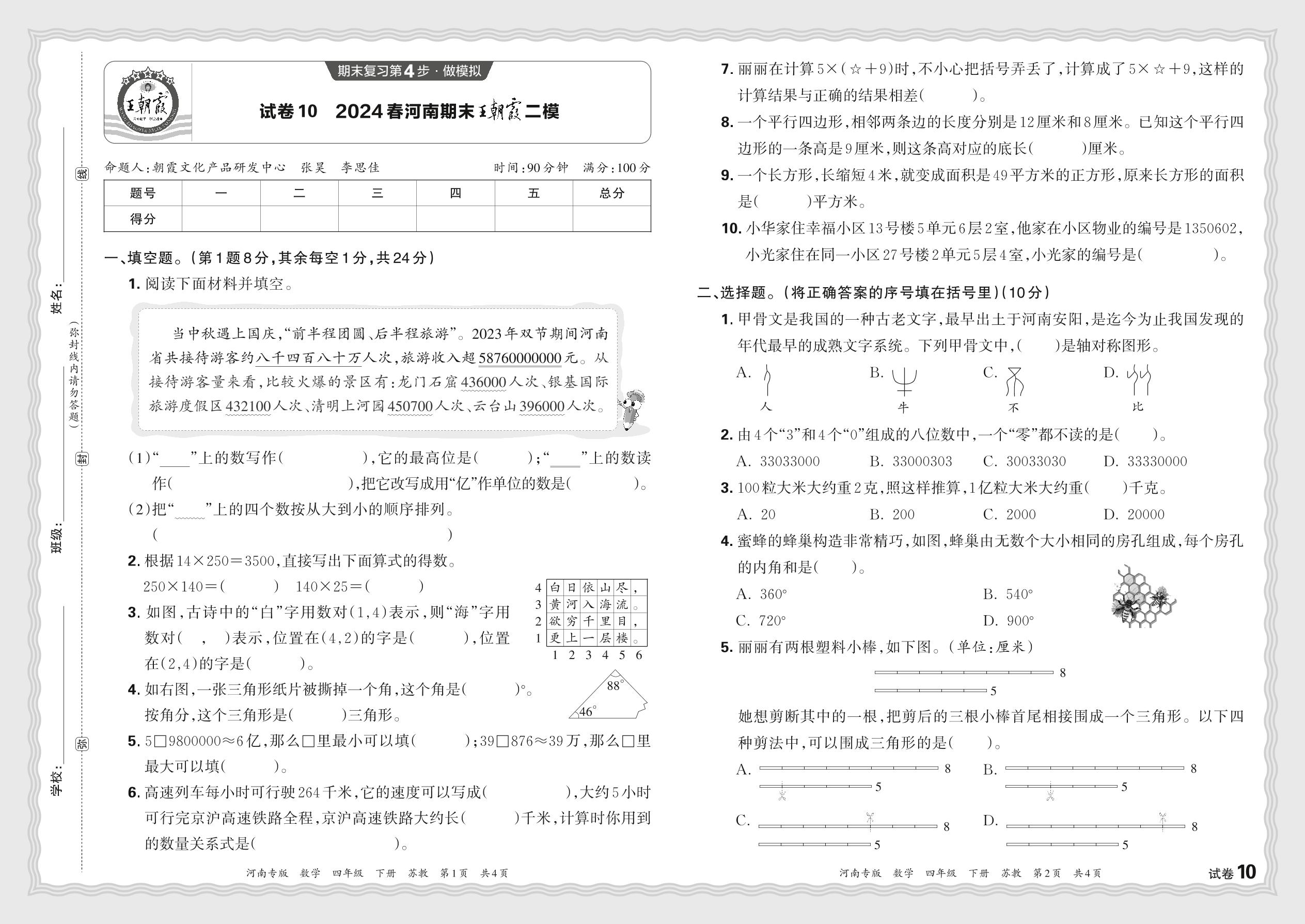 2024春下册四年级数学苏教版 河南期末王朝霞二模