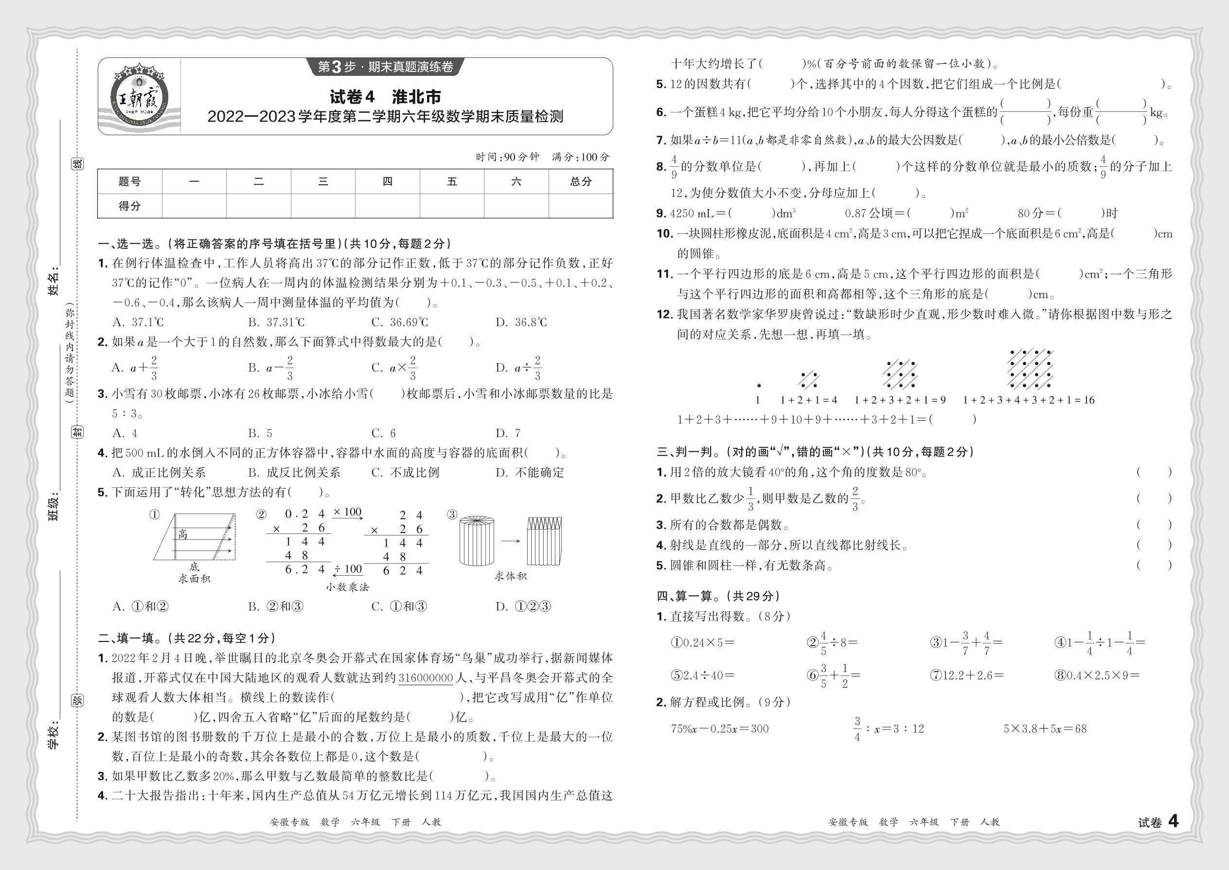 安徽省淮北市2022—2023学年度第二学期六年级数学期末质量检测(人教版)【4】