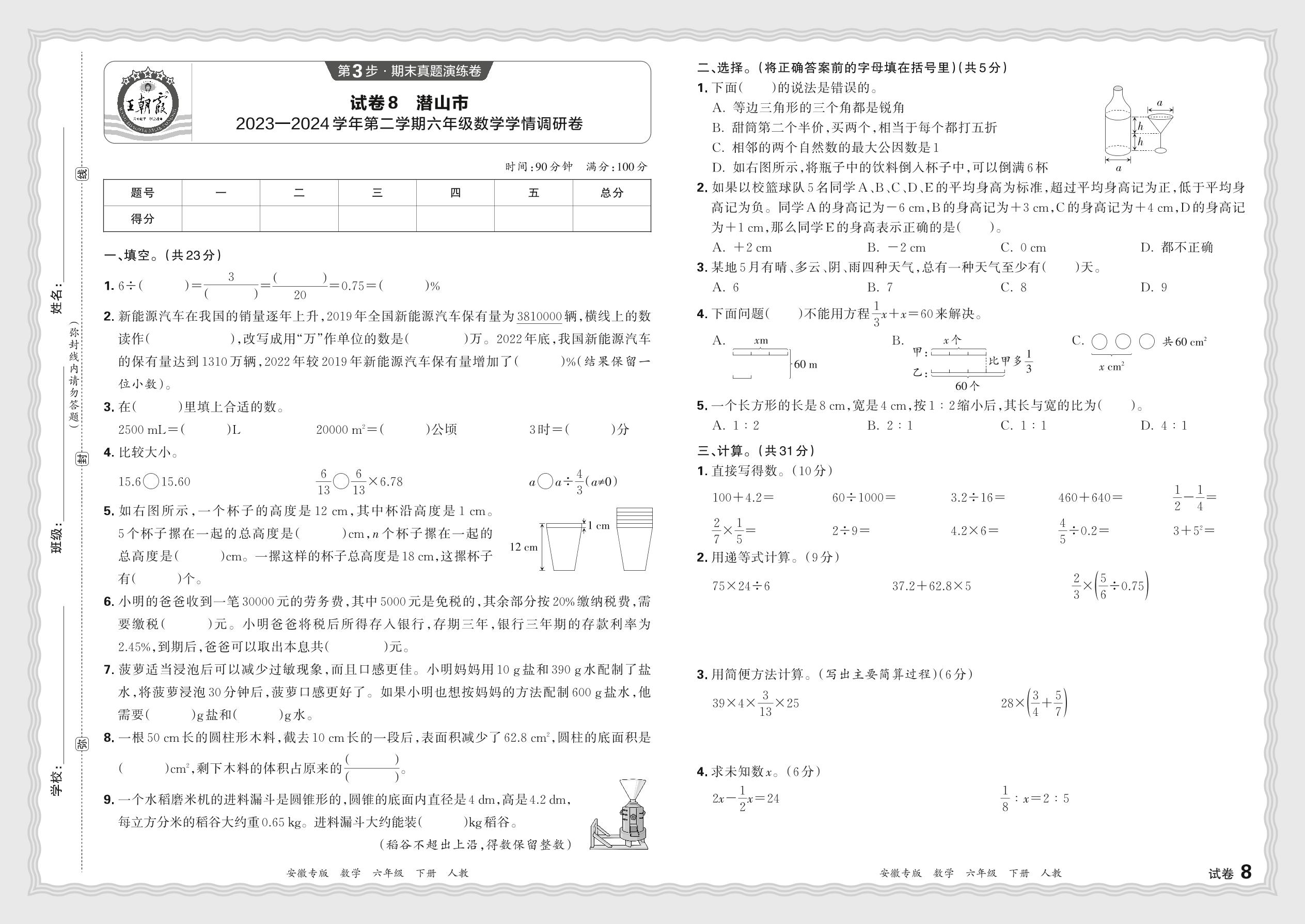 安徽省潜山市2023—2024学年第二学期六年级数学学情调研卷(人教版)【8】