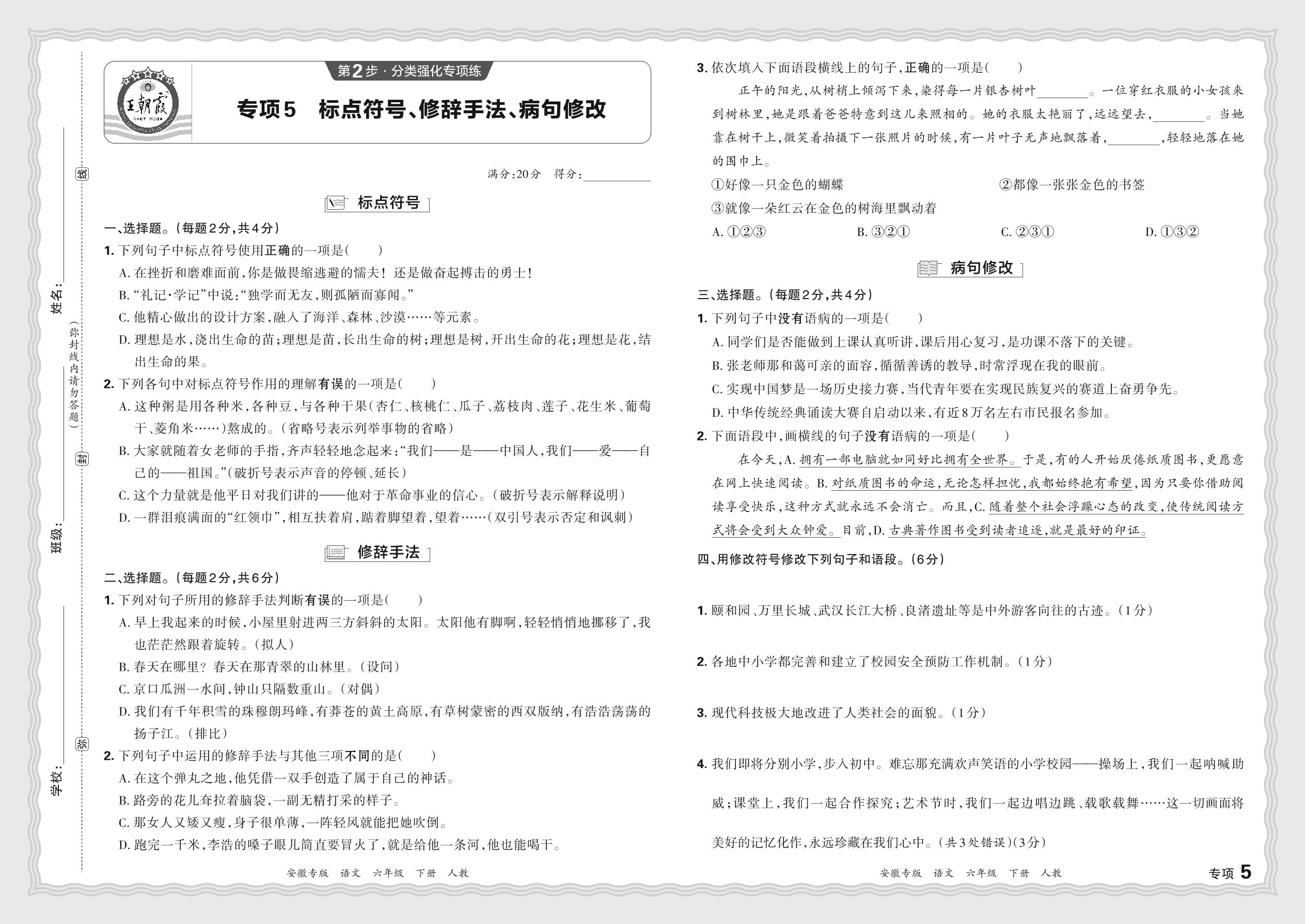 2024春下册六年级语文人教版 期末专项卷安徽版·标点符号、修辞手法、病句修改【5】
