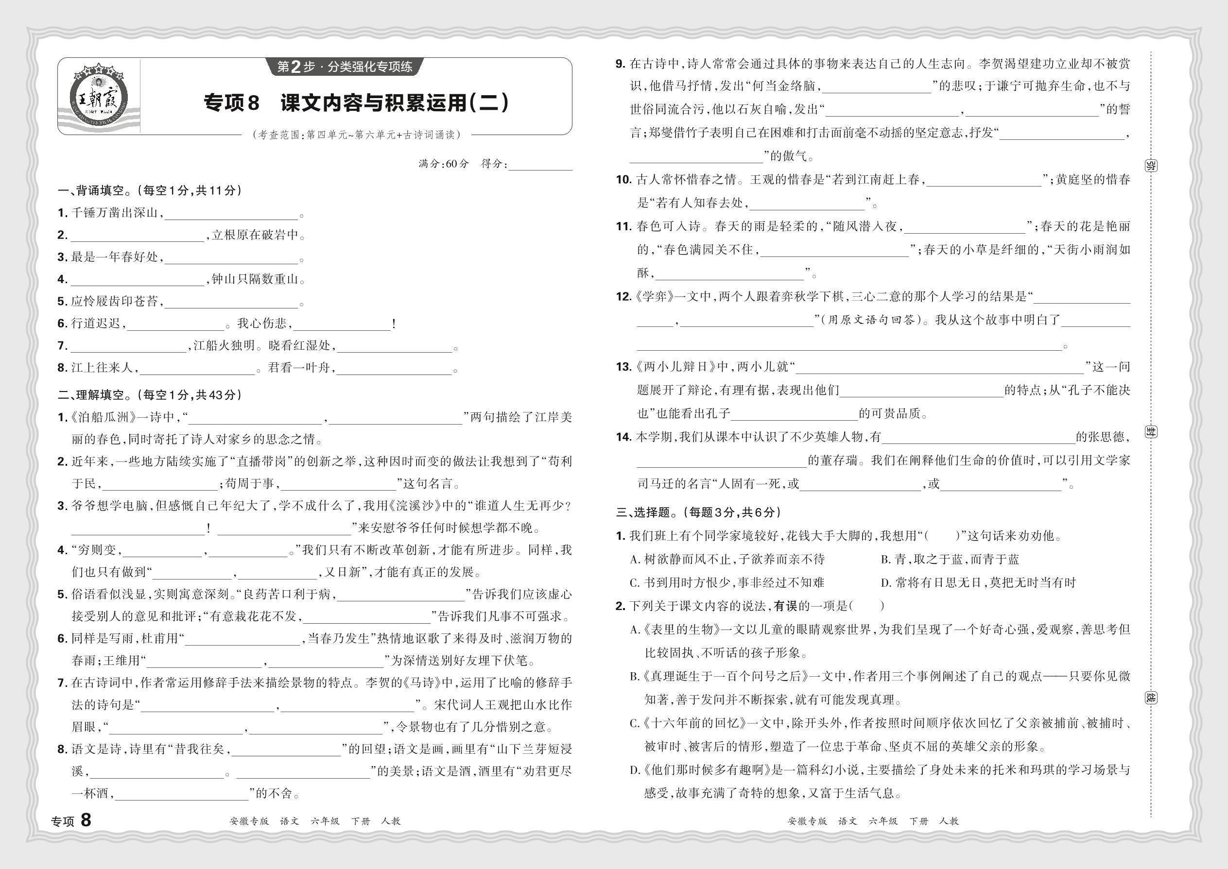 2024春下册六年级语文人教版 期末专项卷安徽版·课文内容与积累运用(二)【8】