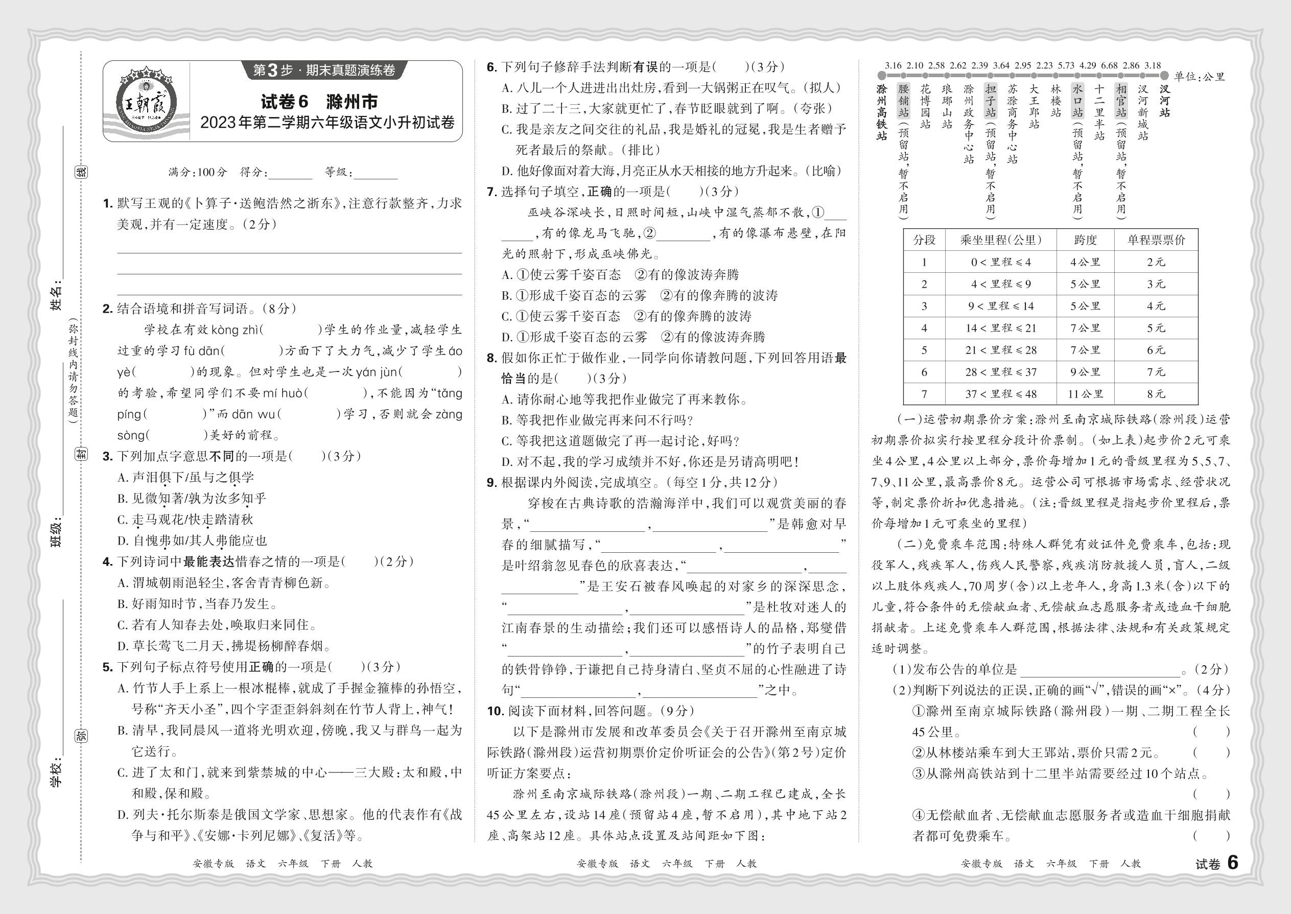 安徽省滁州市2023年第二学期六年级语文小升初试卷(人教版)【6】