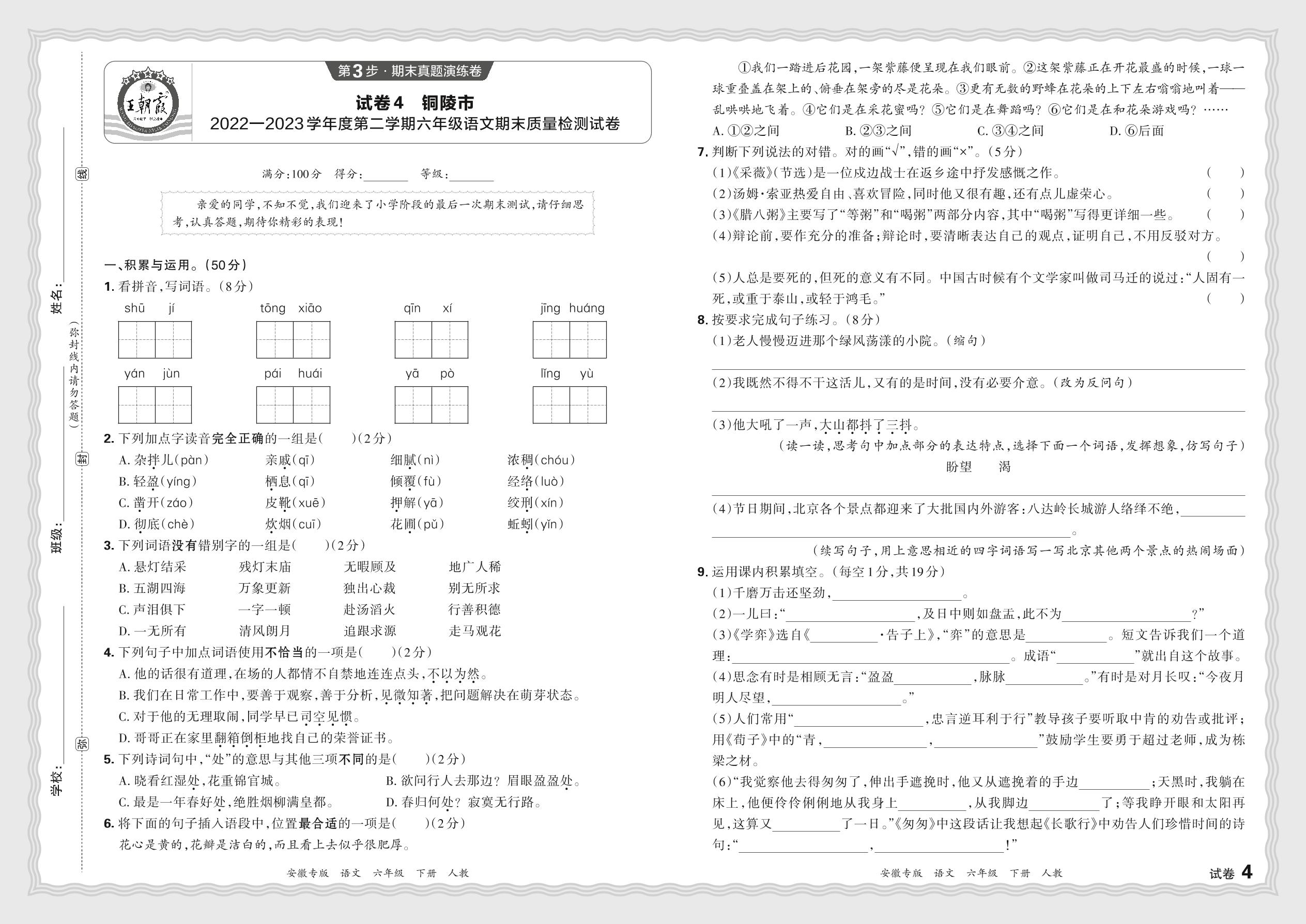 安徽省铜陵市2022—2023学年度第二学期六年级语文期末质量检测试卷(人教版)【4】