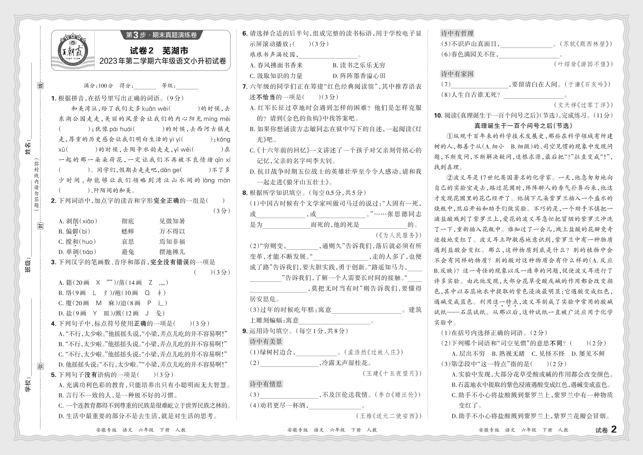 安徽省芜湖市2023年第二学期六年级语文小升初试卷(人教版)【2】