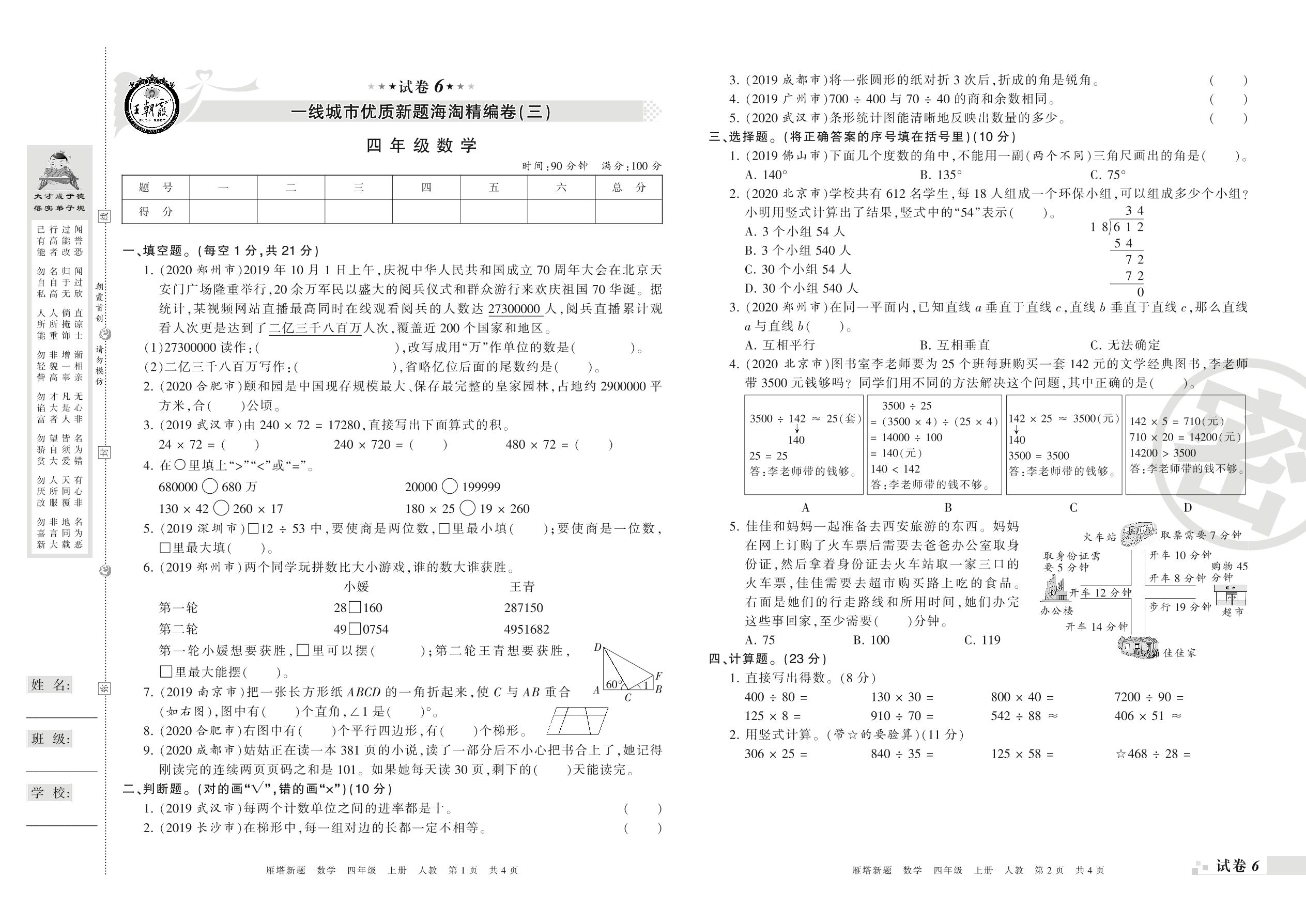 王朝霞海淘期末精编卷四年级上册数学(人教版)【6】