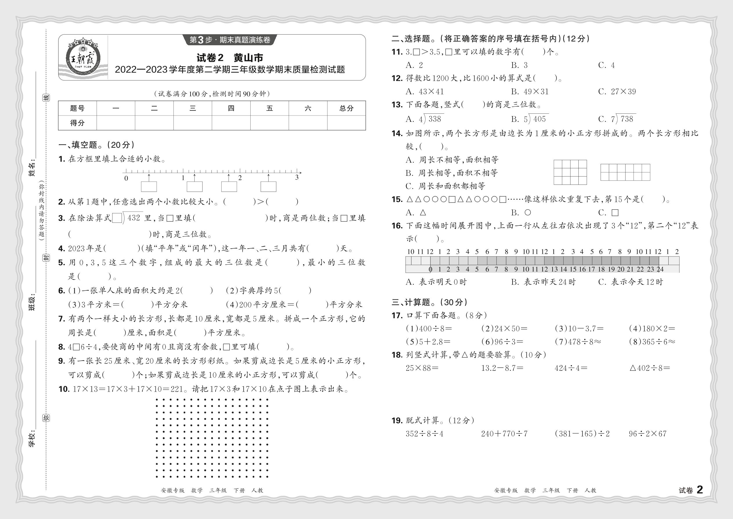 安徽省黄山市2022—2023学年度第二学期三年级数学期末质量检测试题(人教版)【2】