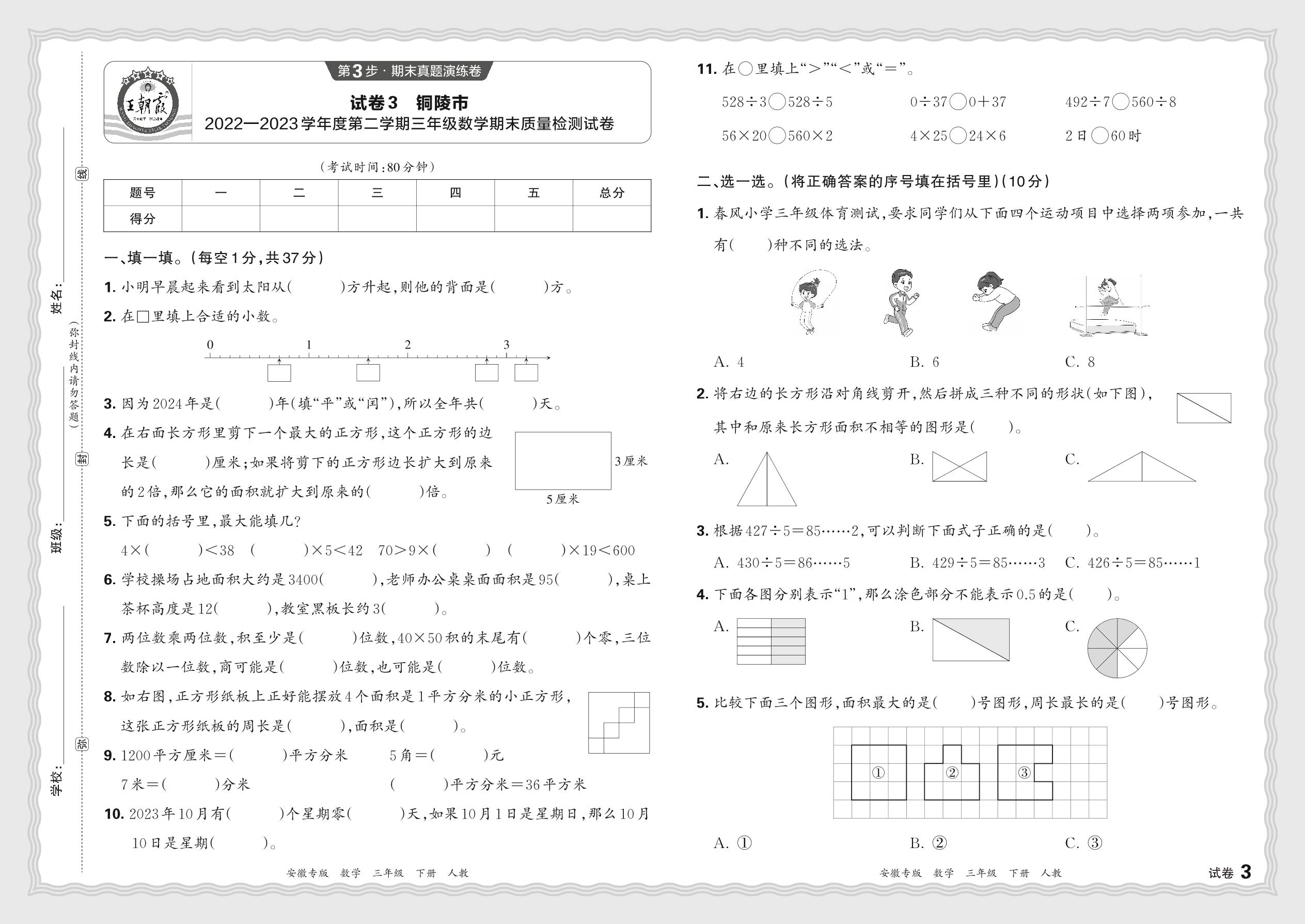 安徽省铜陵市2022—2023学年度第二学期三年级数学期末质量检测试卷(人教版)【3】