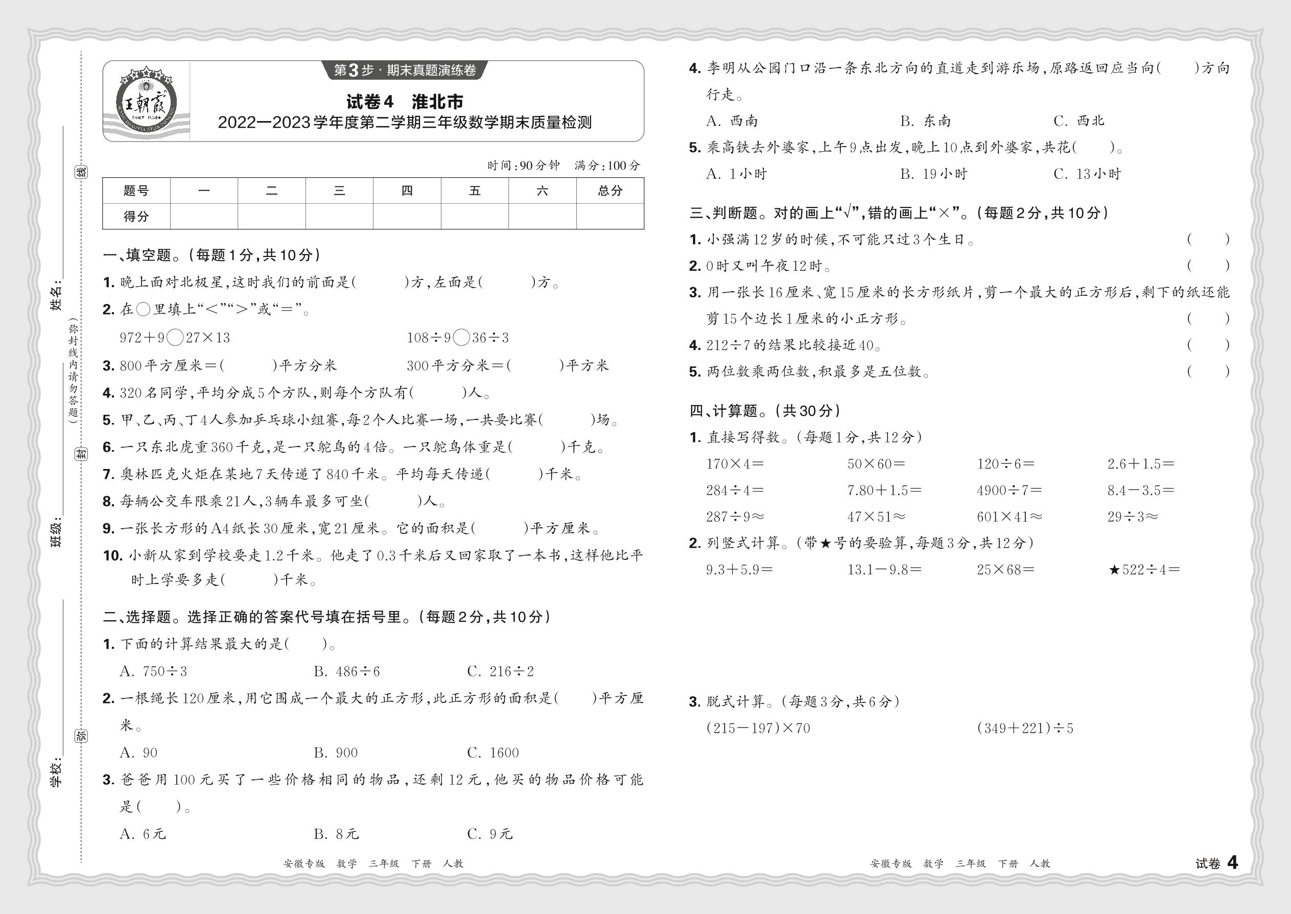 安徽省淮北市2022—2023学年度第二学期三年级数学期末质量检测(人教版)【4】