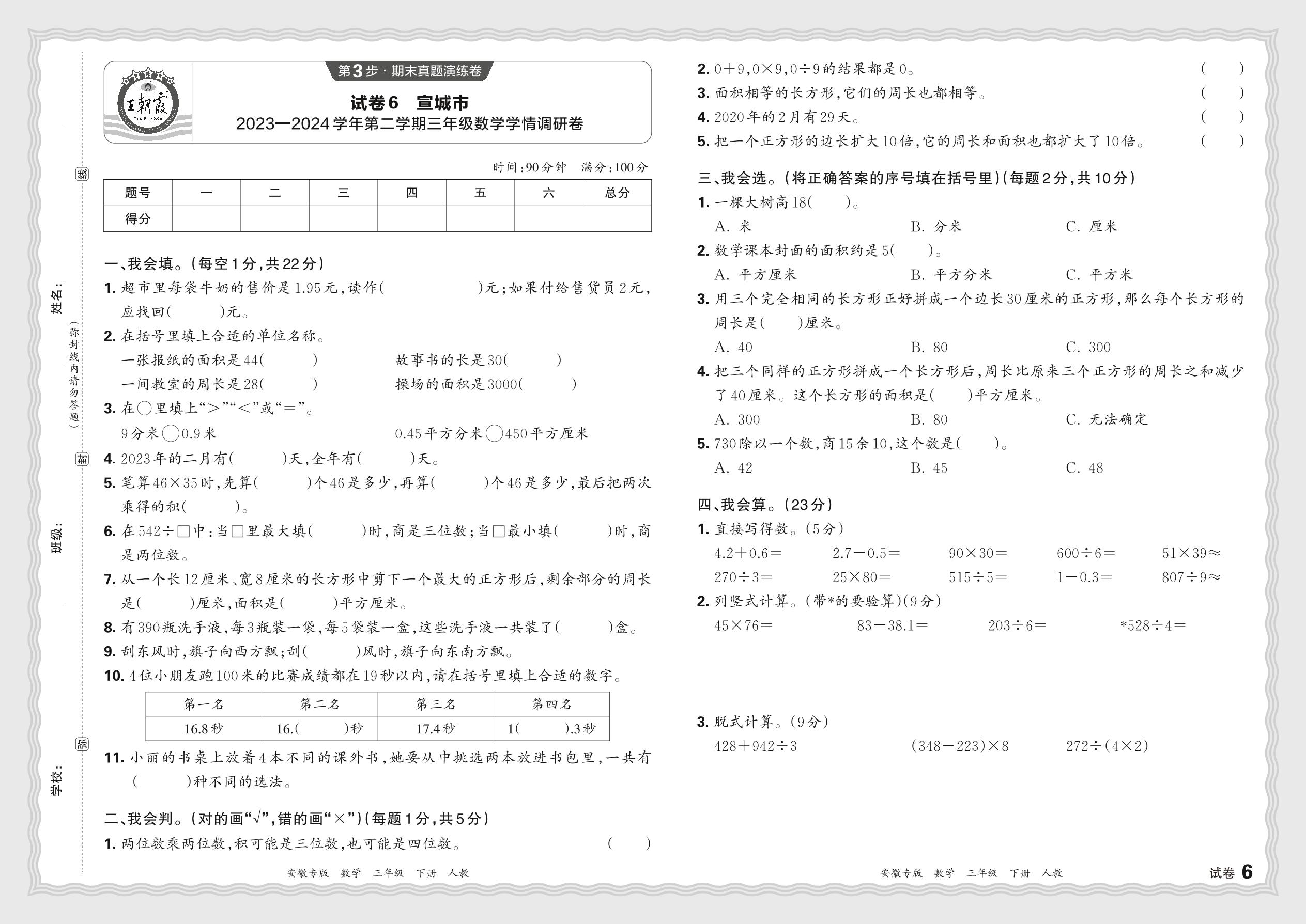 安徽省宣城市2023—2024学年第二学期三年级数学学情调研卷(人教版)【6】