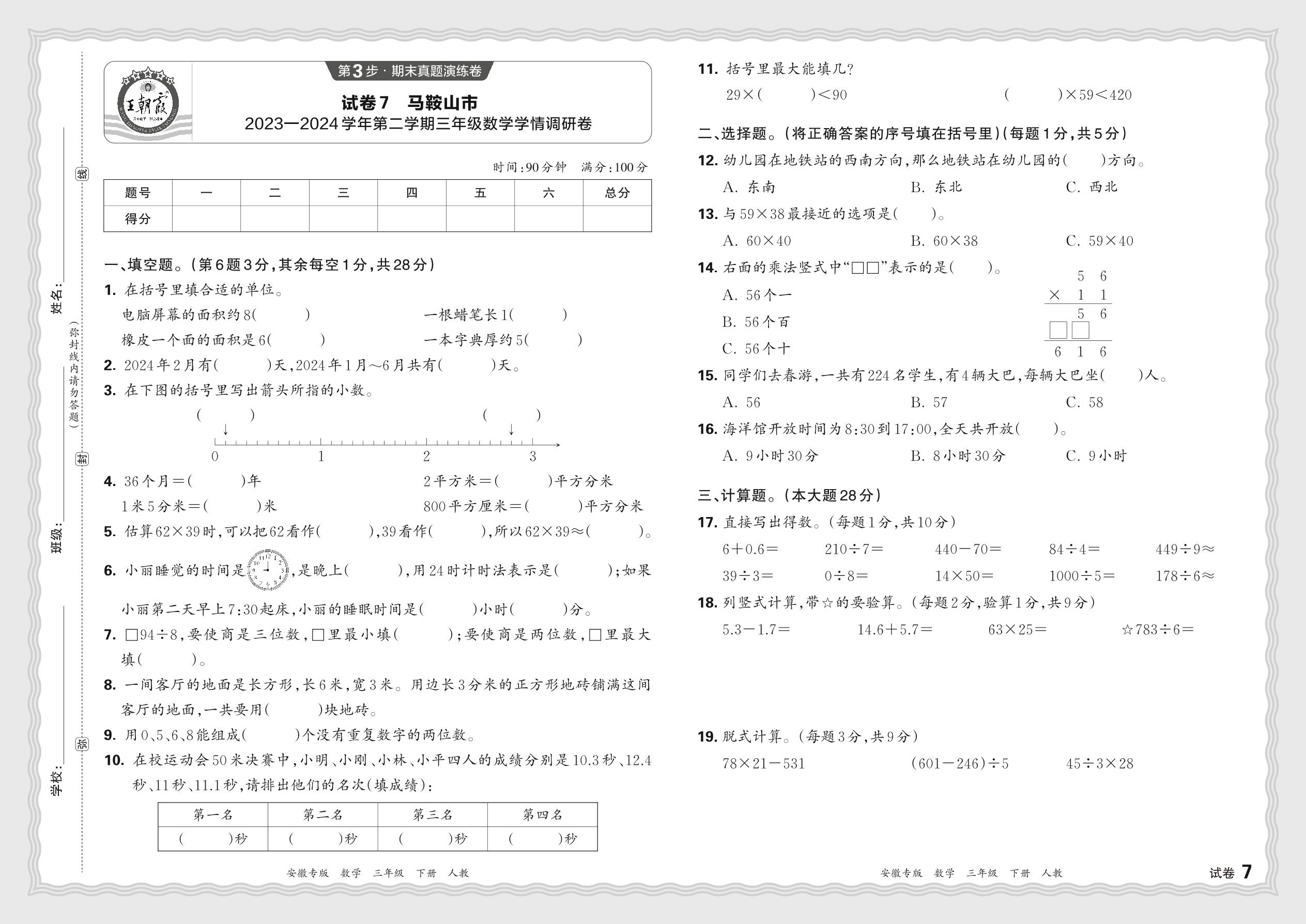 安徽省马鞍山市2023—2024学年第二学期三年级数学学情调研卷(人教版)【7】