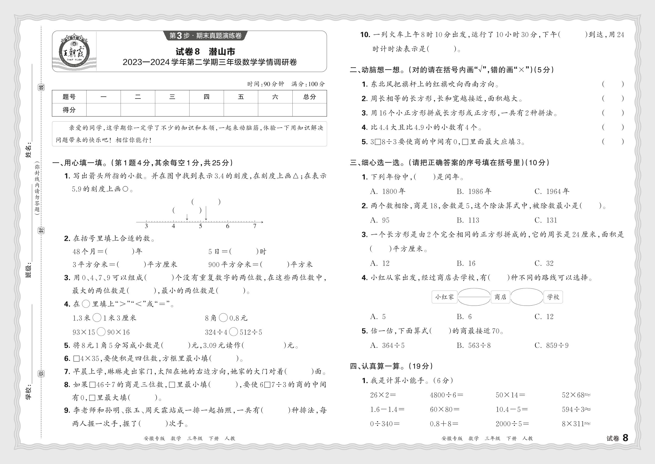 安徽省潜山市2023—2024学年第二学期三年级数学学情调研卷(人教版)【8】