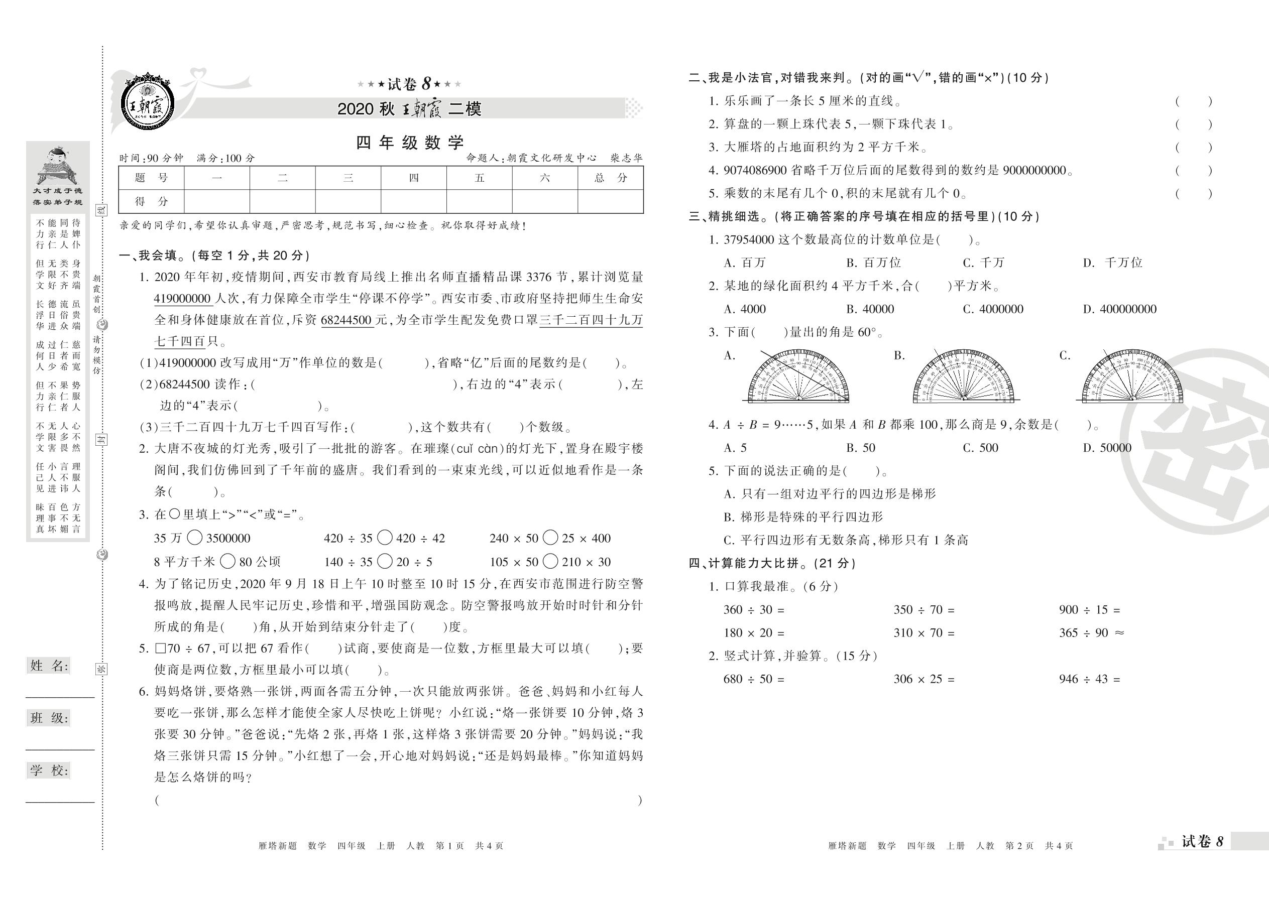 王朝霞期末模拟卷四年级上册数学(人教版)_R210804140053【8】