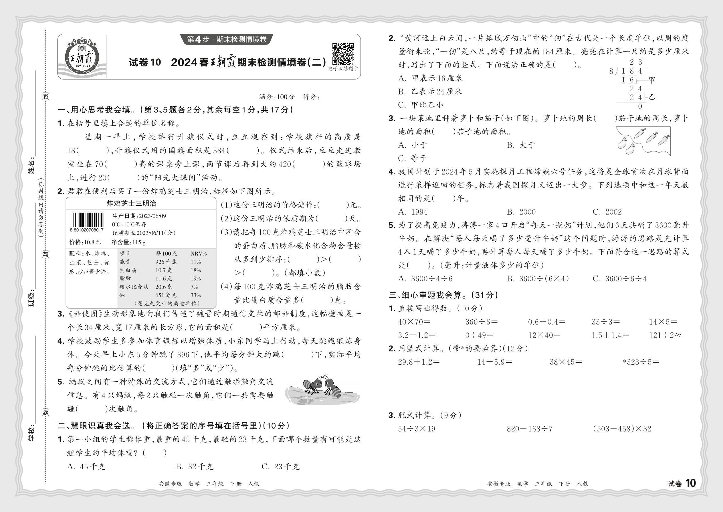2024春下册三年级数学人教版 王朝霞期末检测情境卷(二)