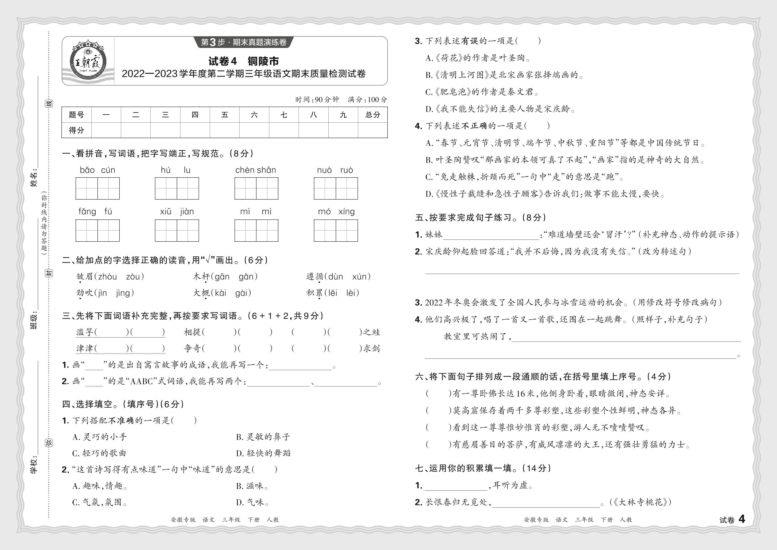 安徽省铜陵市2022—2023学年度第二学期三年级语文期末质量检测试卷(人教版)【4】