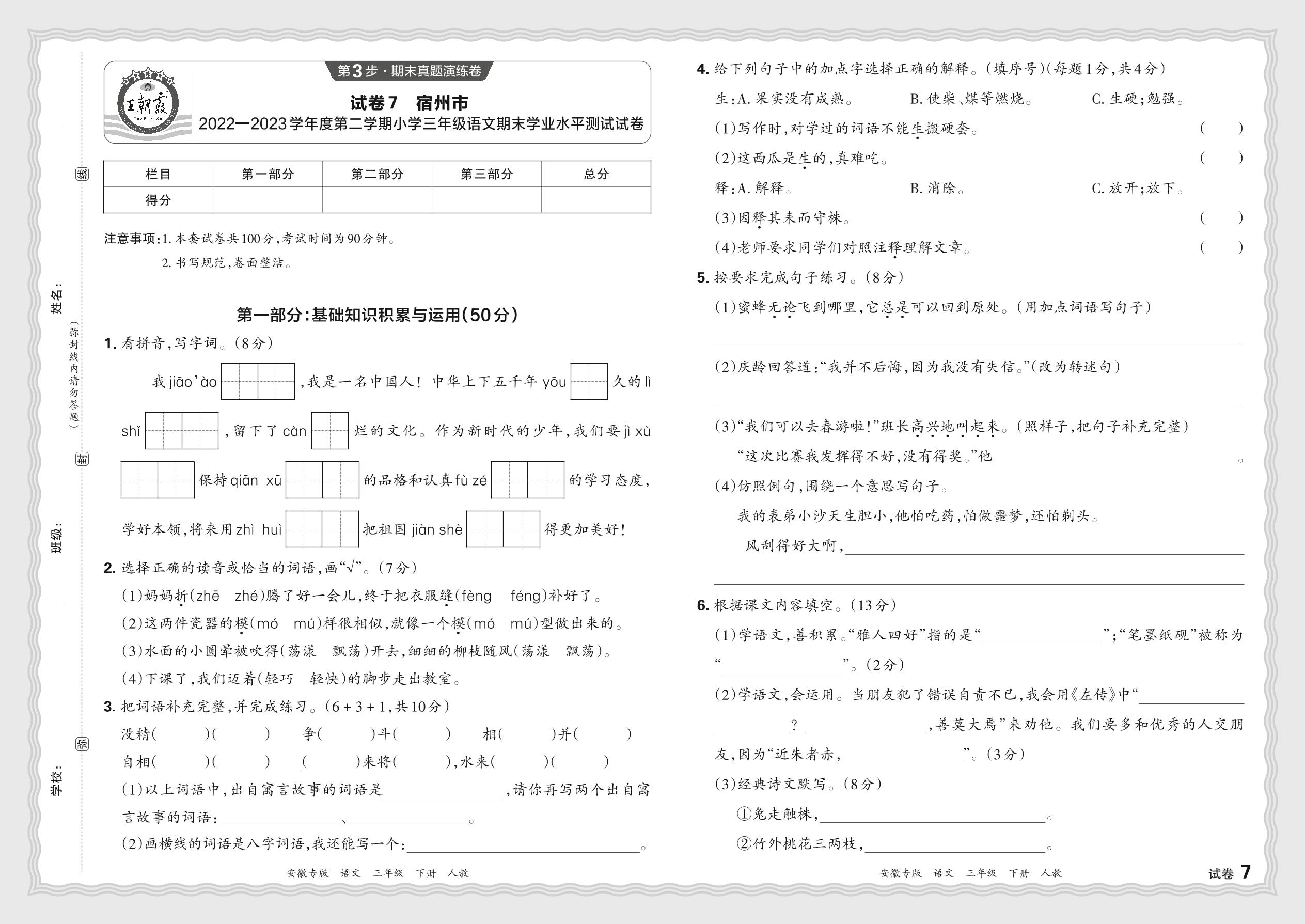 安徽省宿州市2022—2023学年度第二学期小学三年级语文期末学业水平测试试卷(人教版)【7】