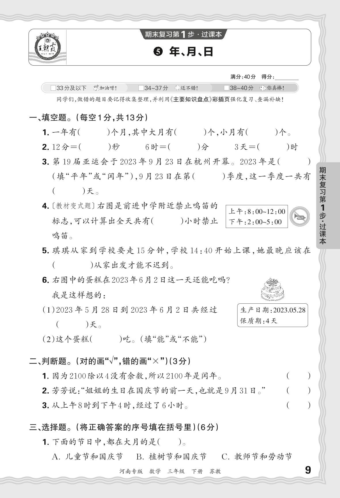 2024春下册三年级数学苏教版 期末过课本河南版·年、月、日【5】
