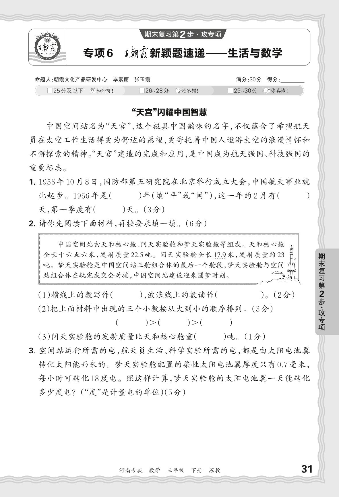 2024春下册三年级数学苏教版 期末专项卷河南版·王朝霞新颖题速递——生活与数学【6】