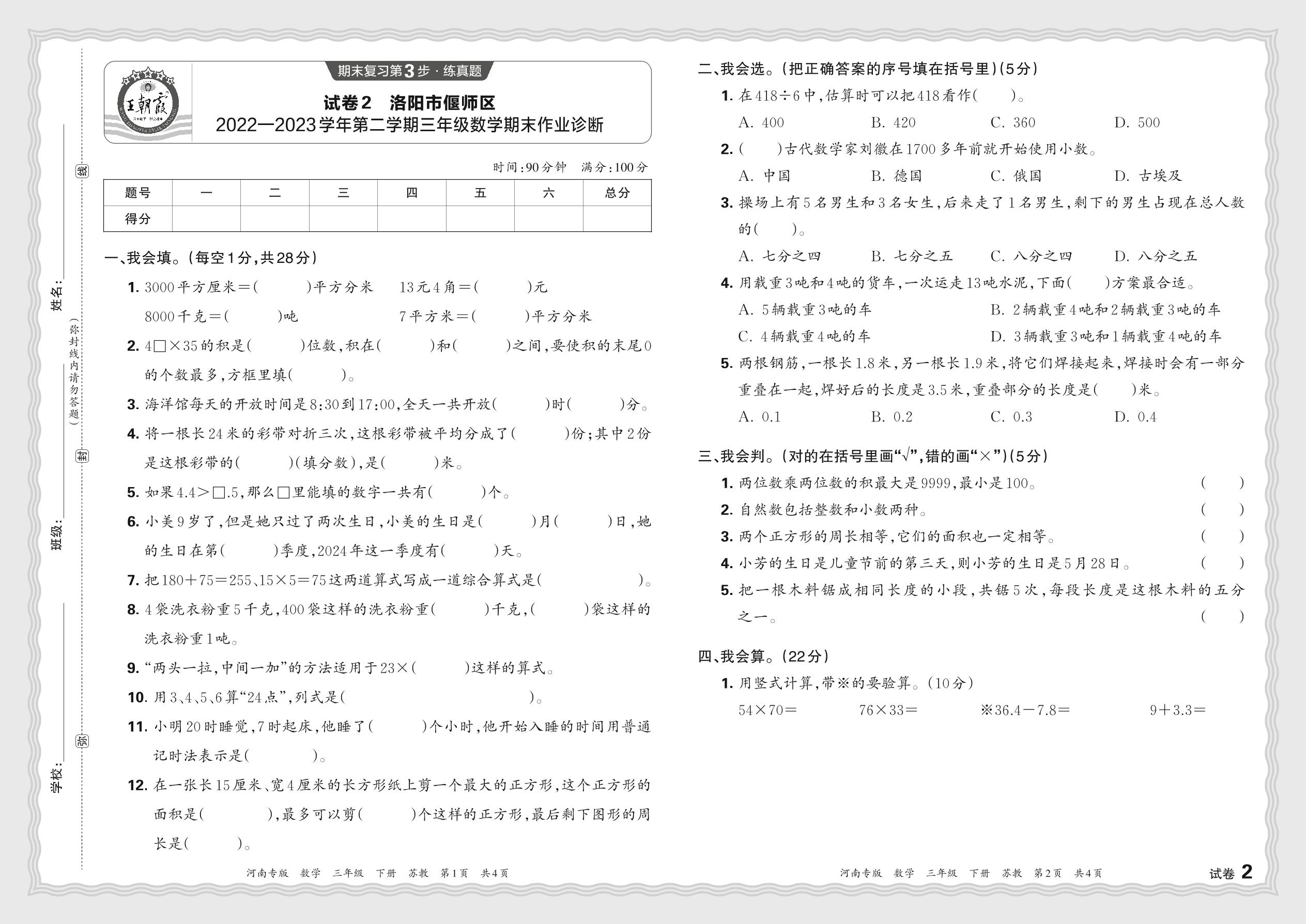 河南省平顶山市洛阳市偃师区2022—2023学年第二学期三年级数学期末作业诊断(苏教版)【2】