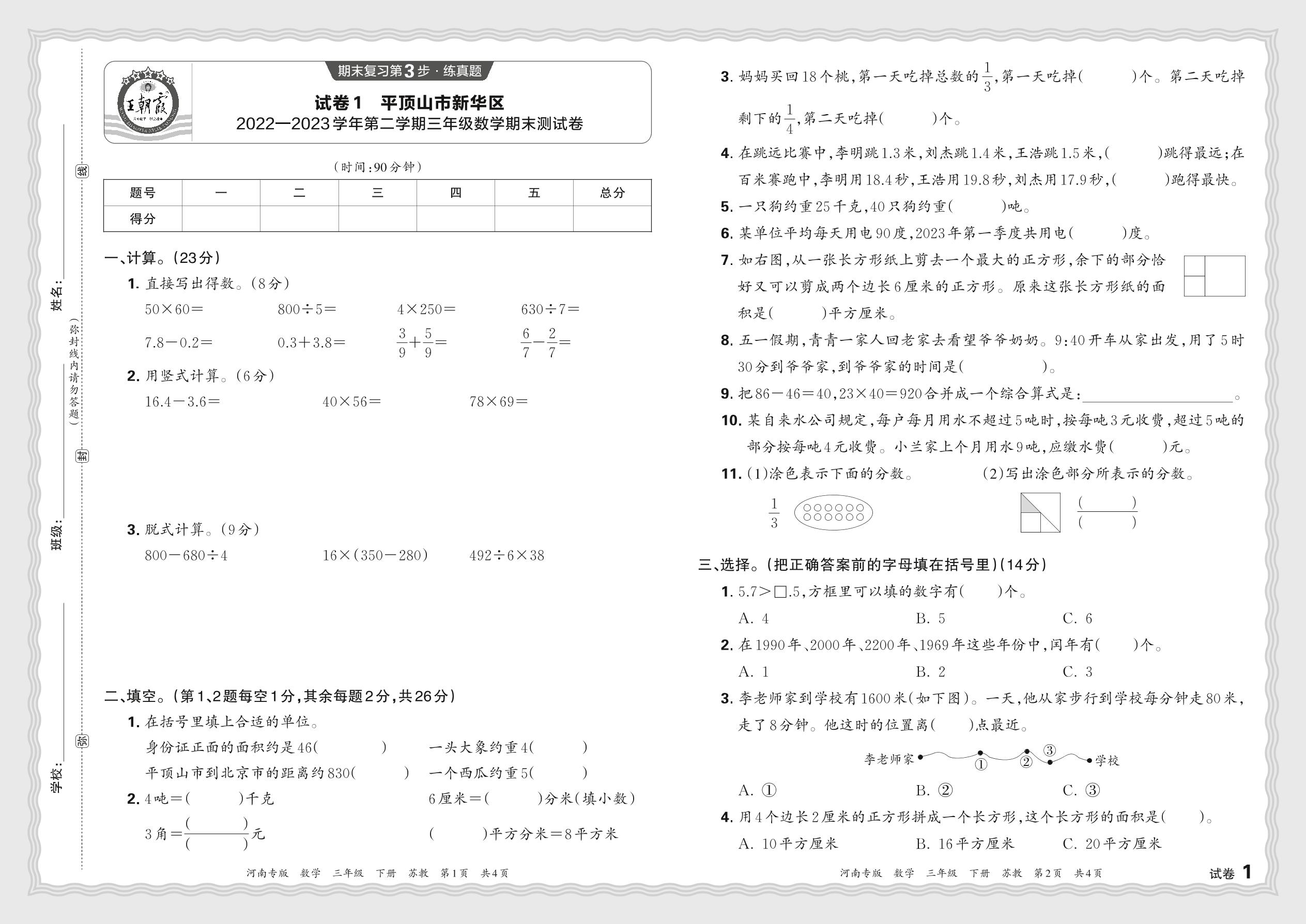 河南省平顶山市新华区2022—2023学年第二学期三年级数学期末测试卷(苏教版)【1】