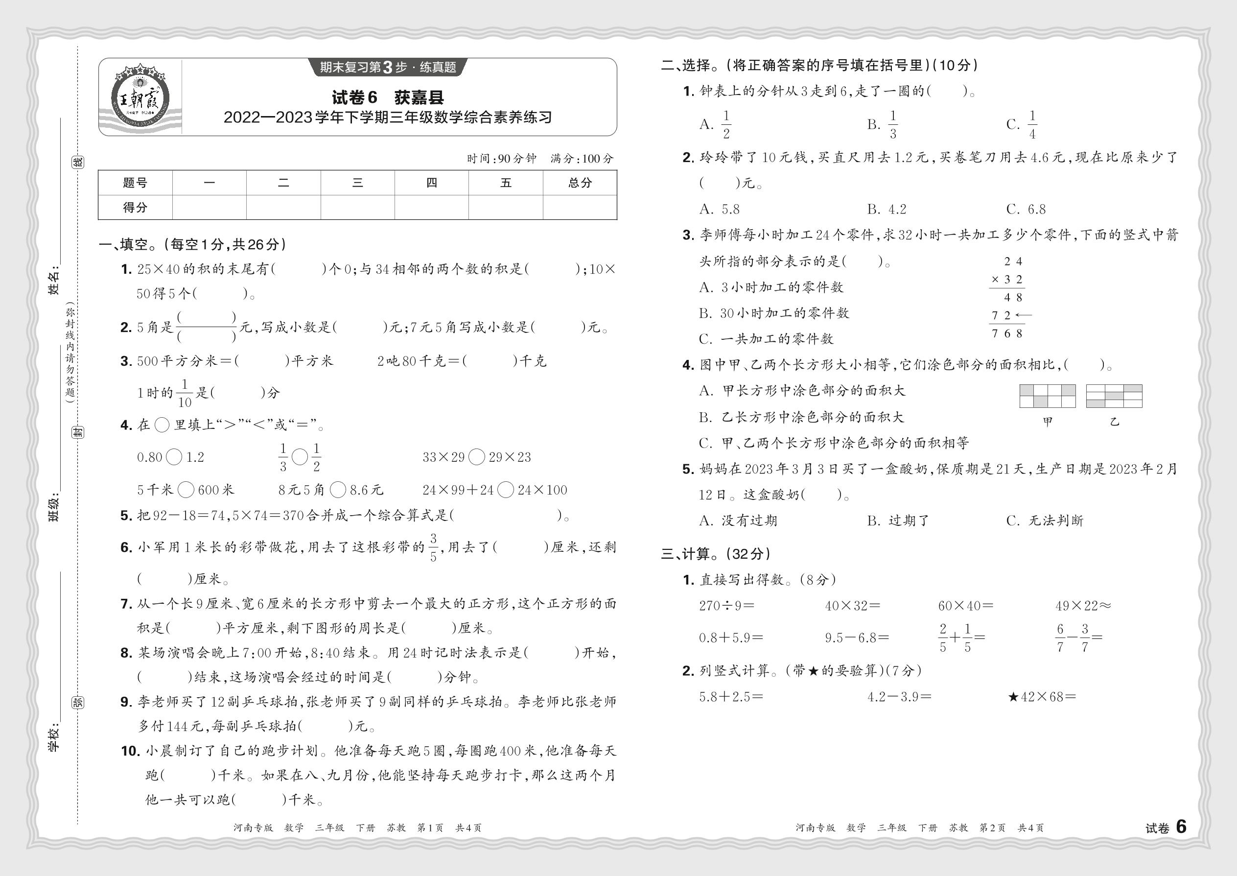 河南省新乡市获嘉县2022—2023学年下学期三年级数学综合素养练习(苏教版)【6】