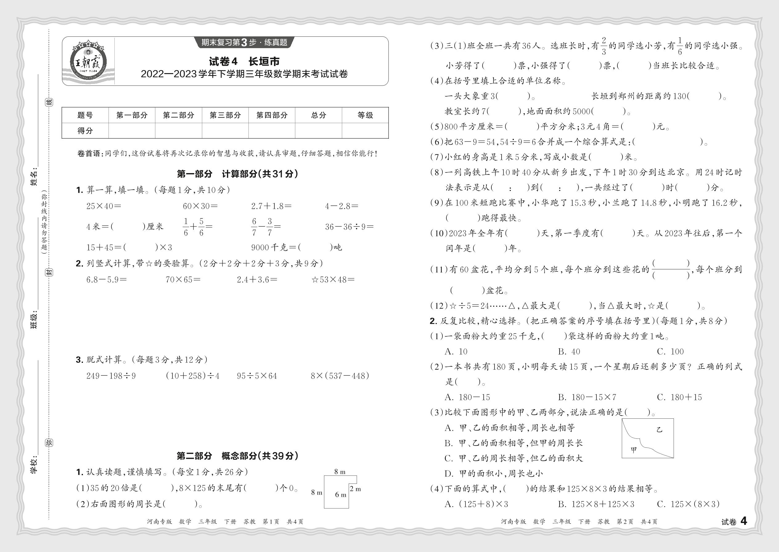河南省新乡市长垣市2022—2023学年下学期三年级数学期末考试试卷(苏教版)【4】