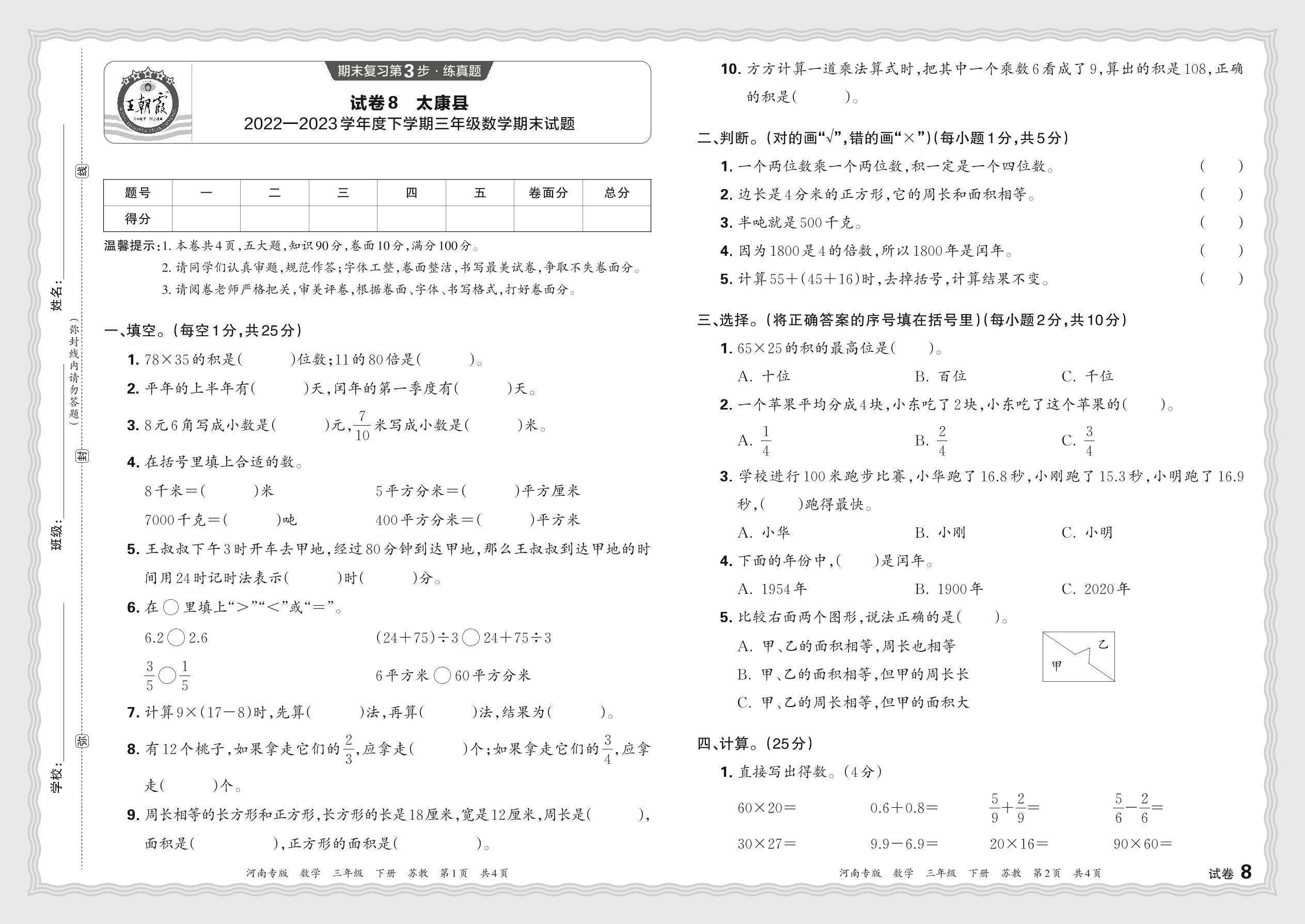 河南省周口市太康县2022—2023学年度下学期三年级数学期末试题(苏教版)【8】