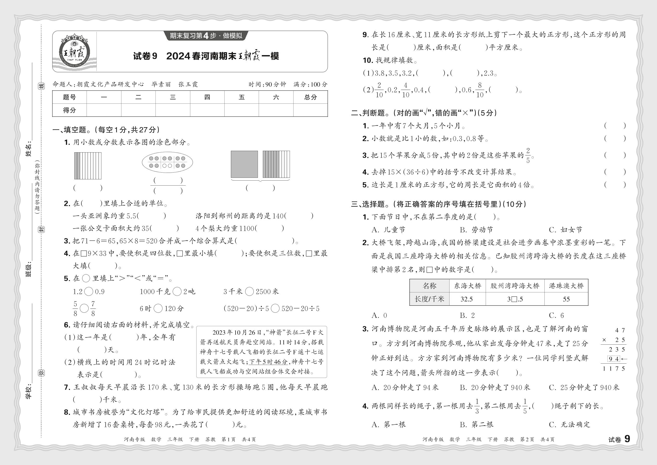 2024春下册三年级数学苏教版 河南期末王朝霞一模