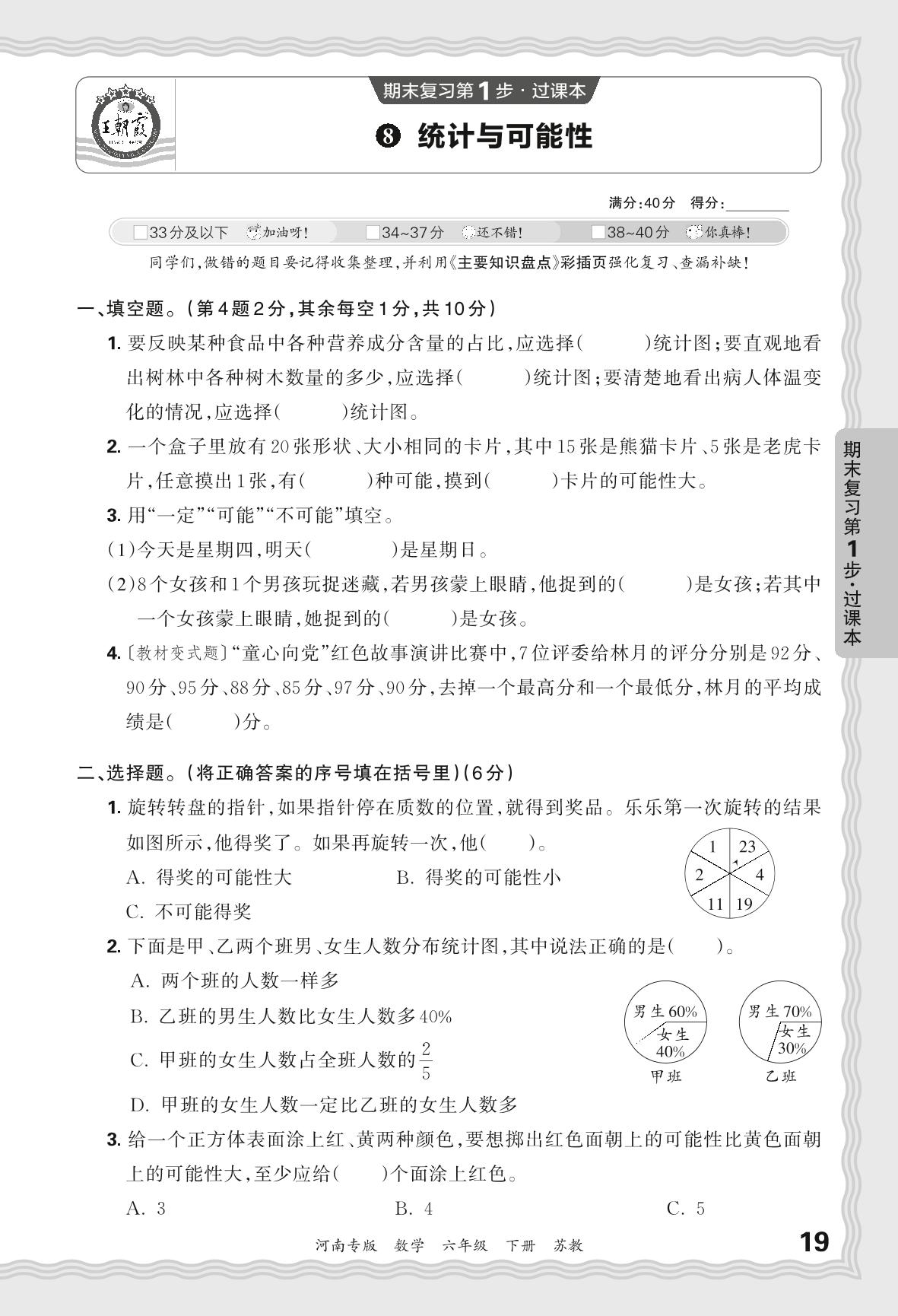 2024春下册六年级数学苏教版 期末过课本河南版·统计与可能性