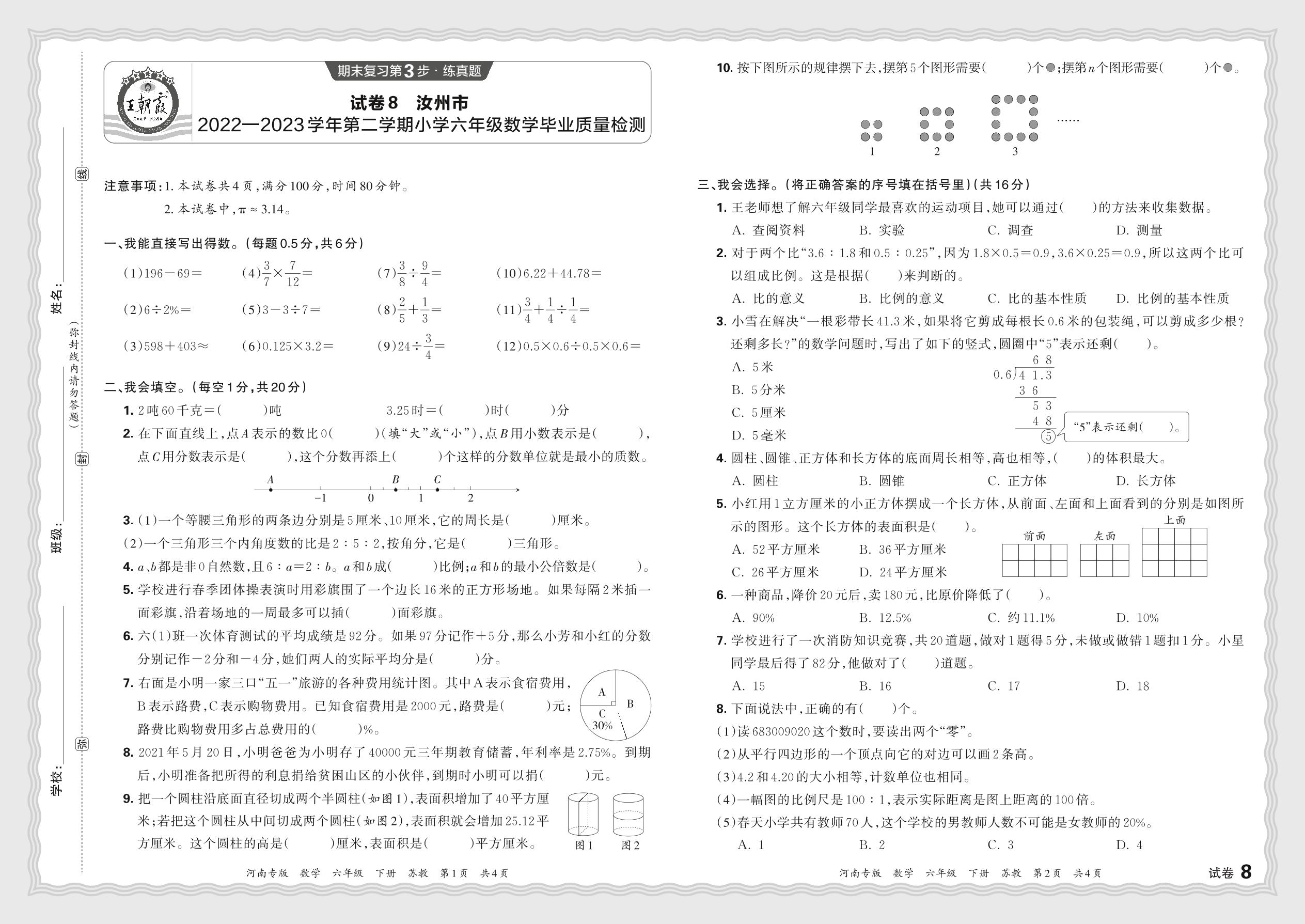 河南省平顶山市汝州市2022—2023学年第二学期小学六年级数学毕业质量检测(苏教版)【8】