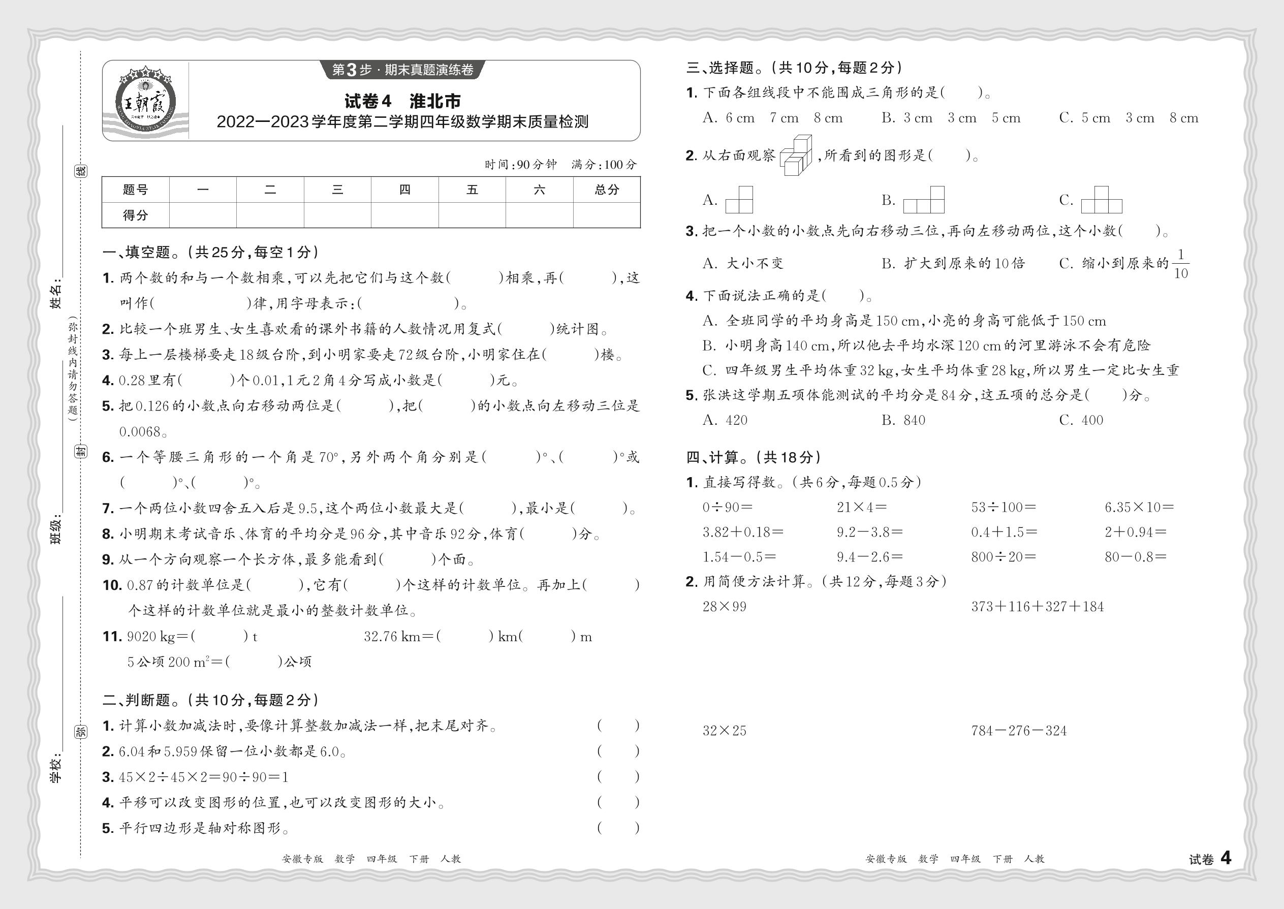 安徽省淮北市2022—2023学年度第二学期四年级数学期末质量检测(人教版)【4】