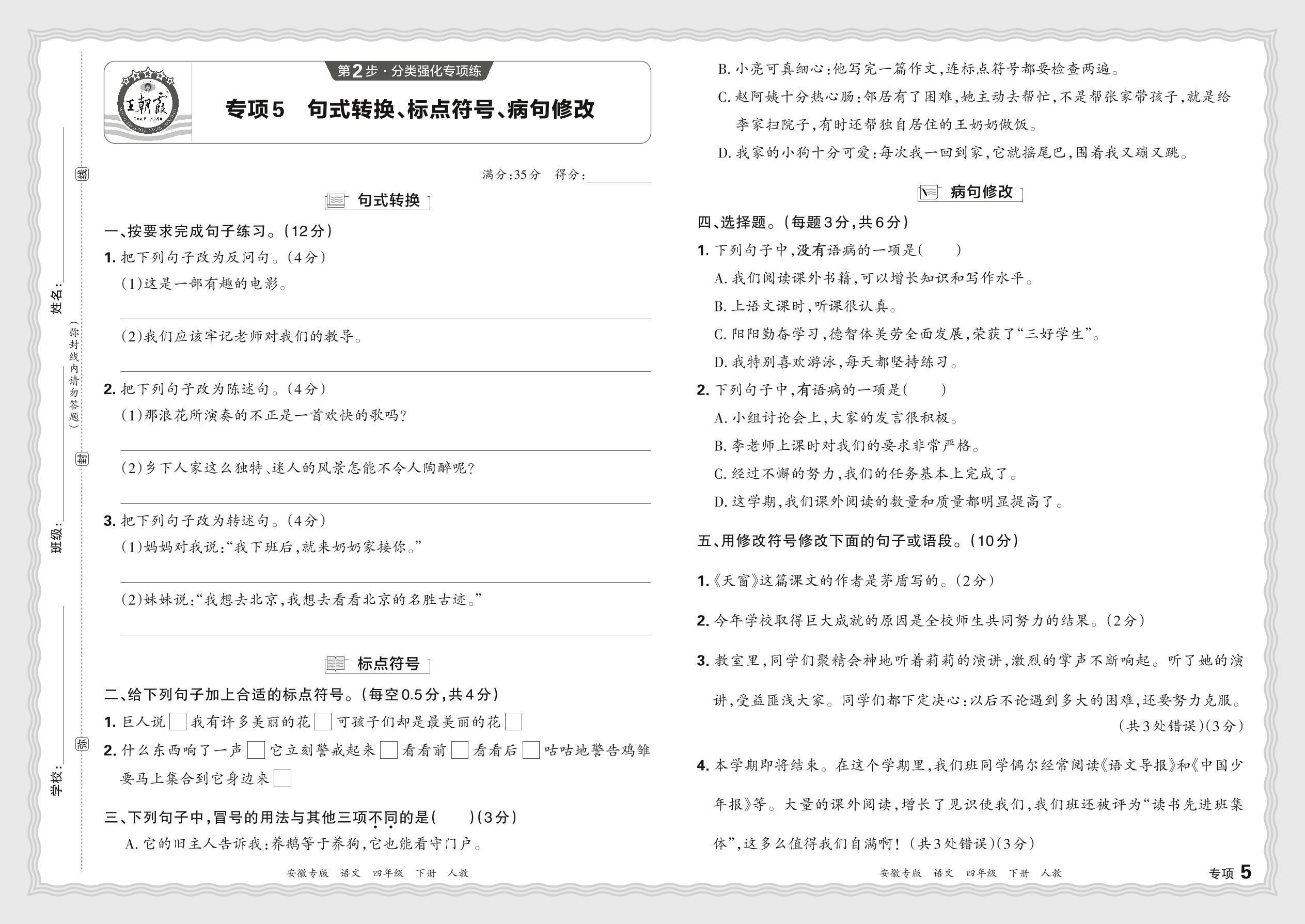 2024春下册四年级语文人教版 期末专项卷安徽版·句式转换、标点符号、病句修改【5】