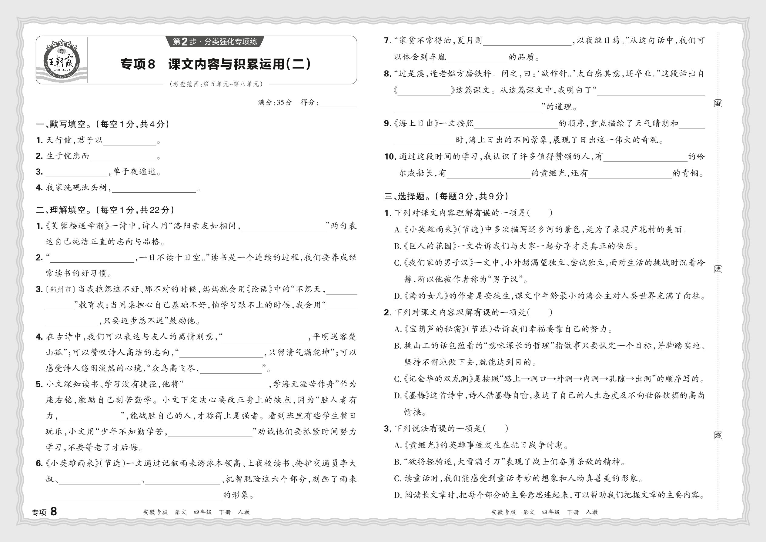 2024春下册四年级语文人教版 期末专项卷安徽版·课文内容与积累运用(二)【8】