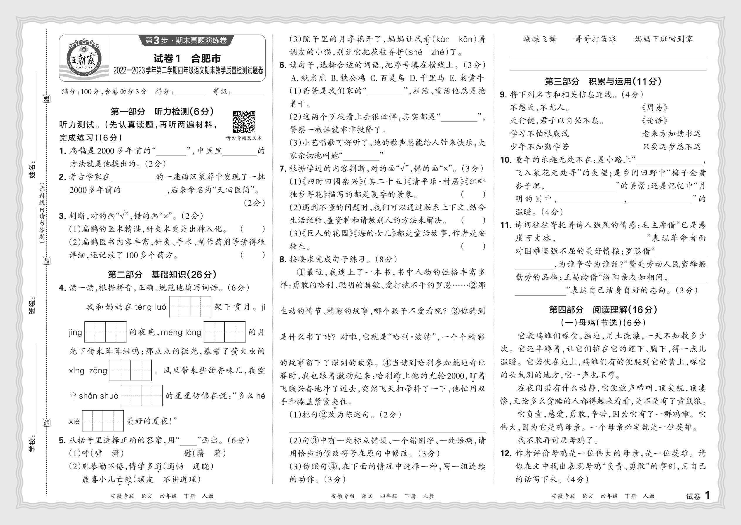 安徽省合肥市2022—2023学年第二学期四年级语文期末教学质量检测试题卷(人教版)【1】