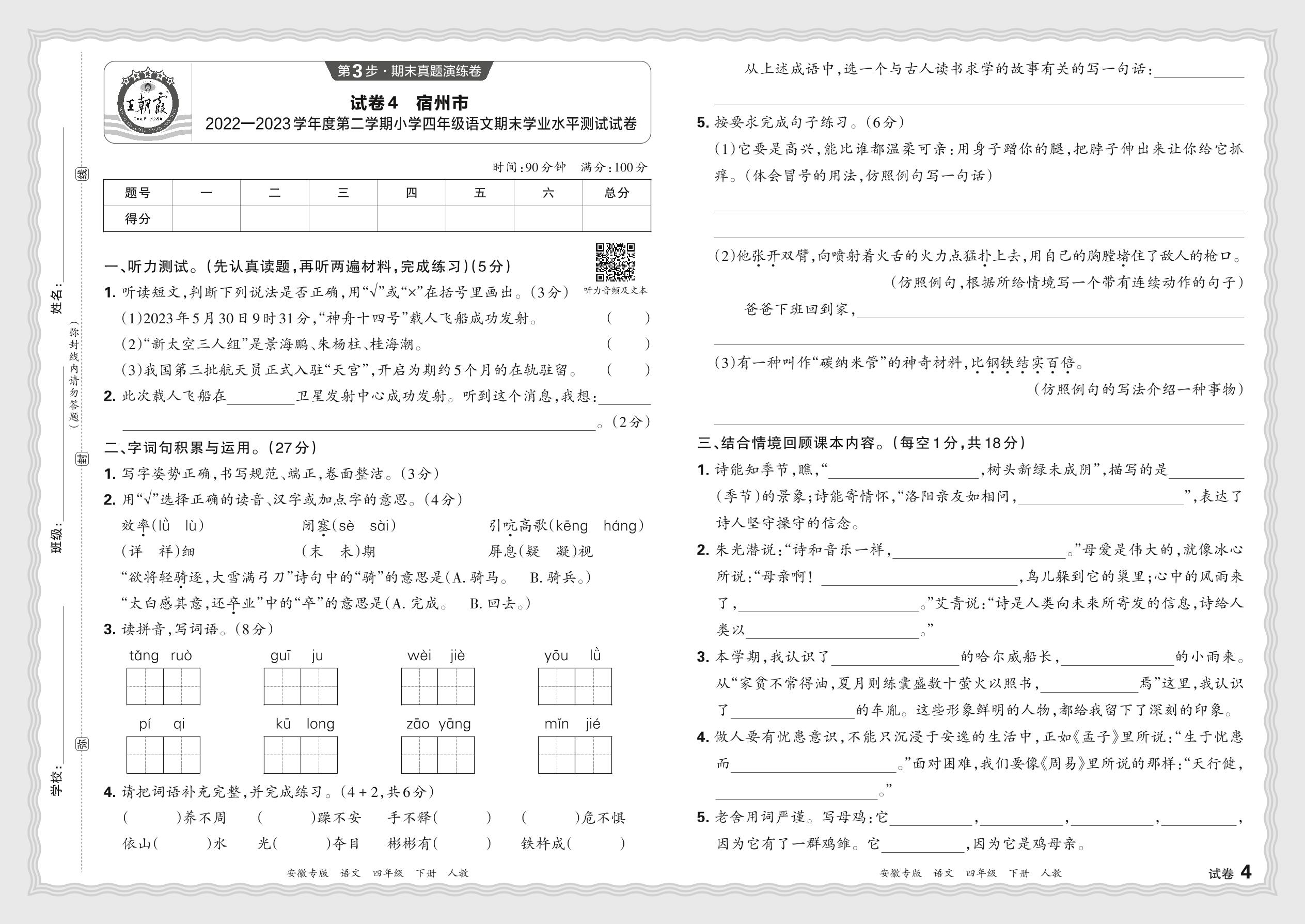 安徽省宿州市2022—2023学年度第二学期小学四年级语文期末学业水平测试试卷(人教版)【4】