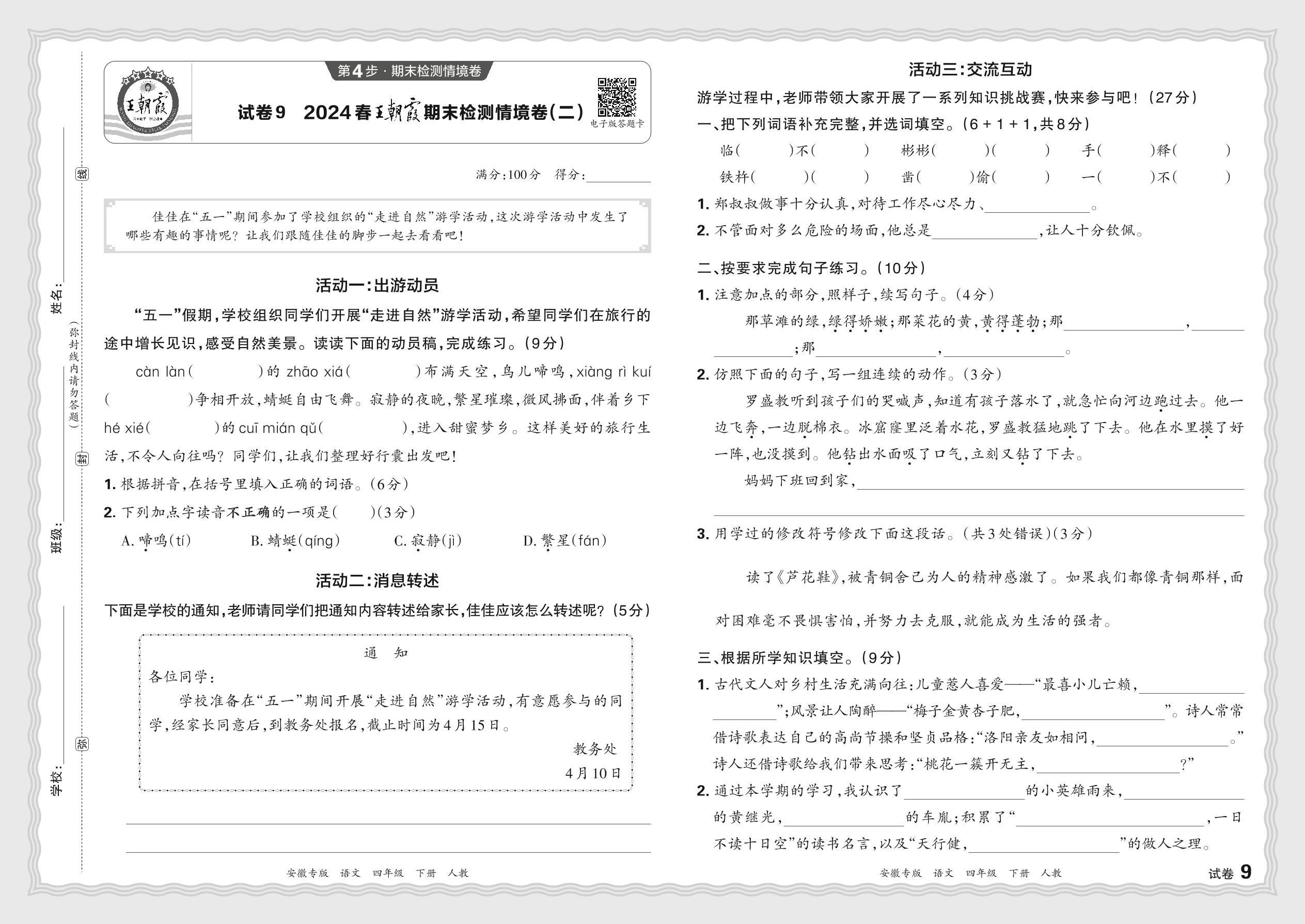 2024春下册四年级语文人教版 王朝霞期末检测情境卷(二)