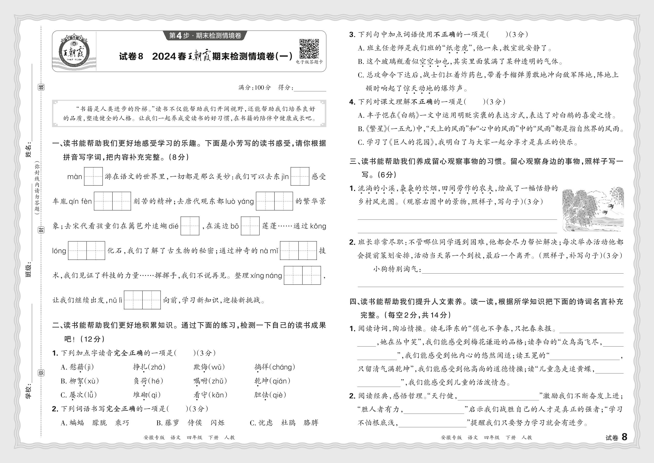 2024春下册四年级语文人教版 王朝霞期末检测情境卷(一)