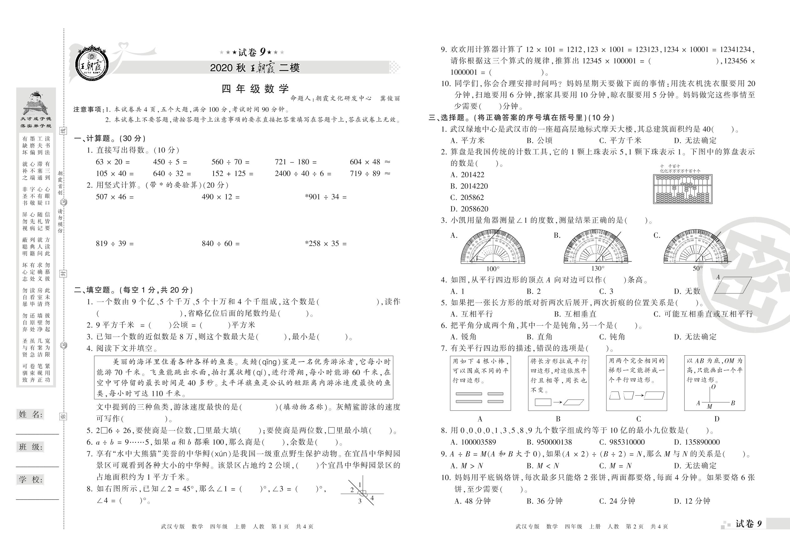 王朝霞期末模拟卷四年级上册数学(人教版)_R210804140152【9】