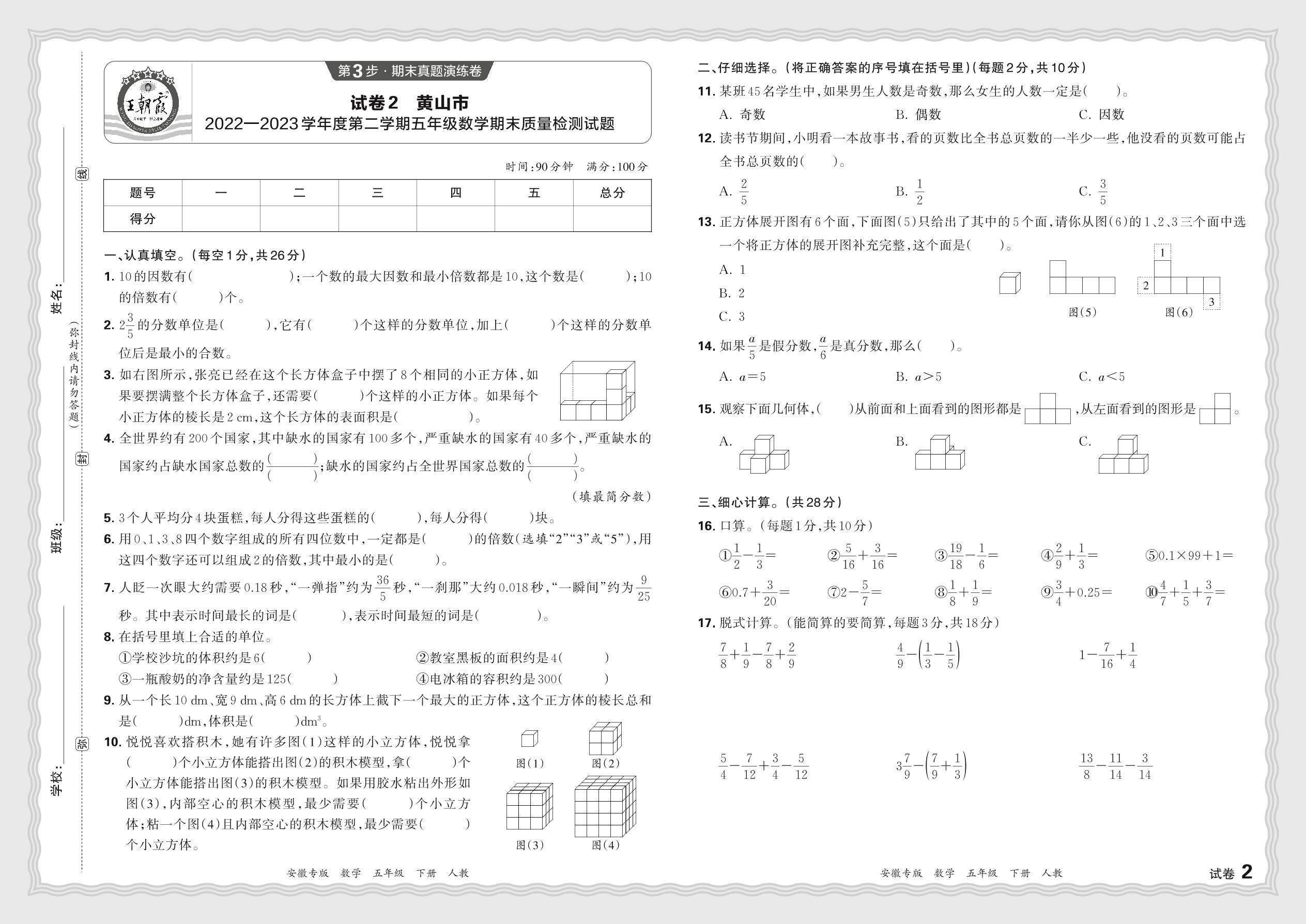 安徽省黄山市2022—2023学年度第二学期五年级数学期末质量检测试题(人教版)【2】