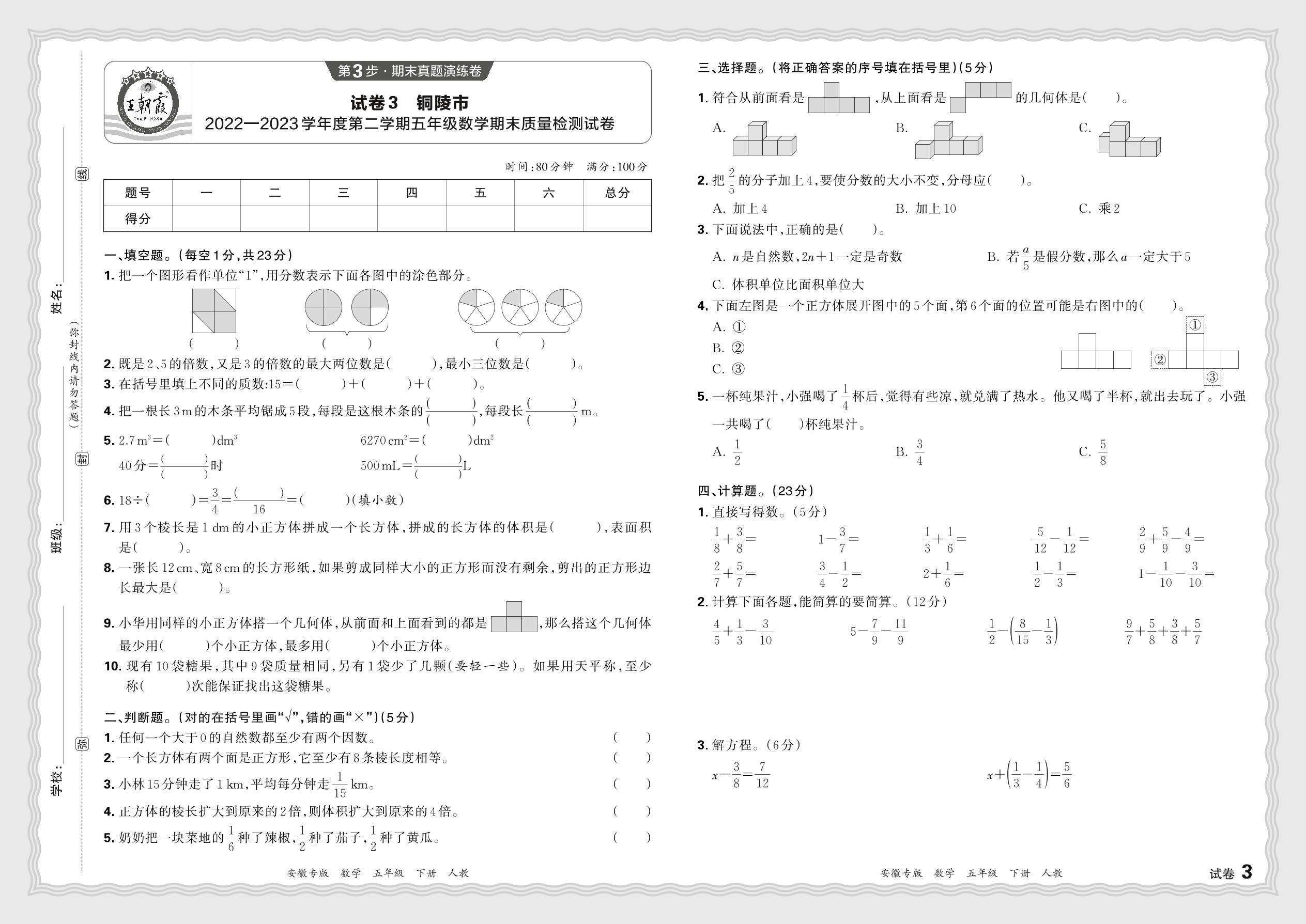 安徽省铜陵市2022—2023学年度第二学期五年级数学期末质量检测试卷(人教版)【3】