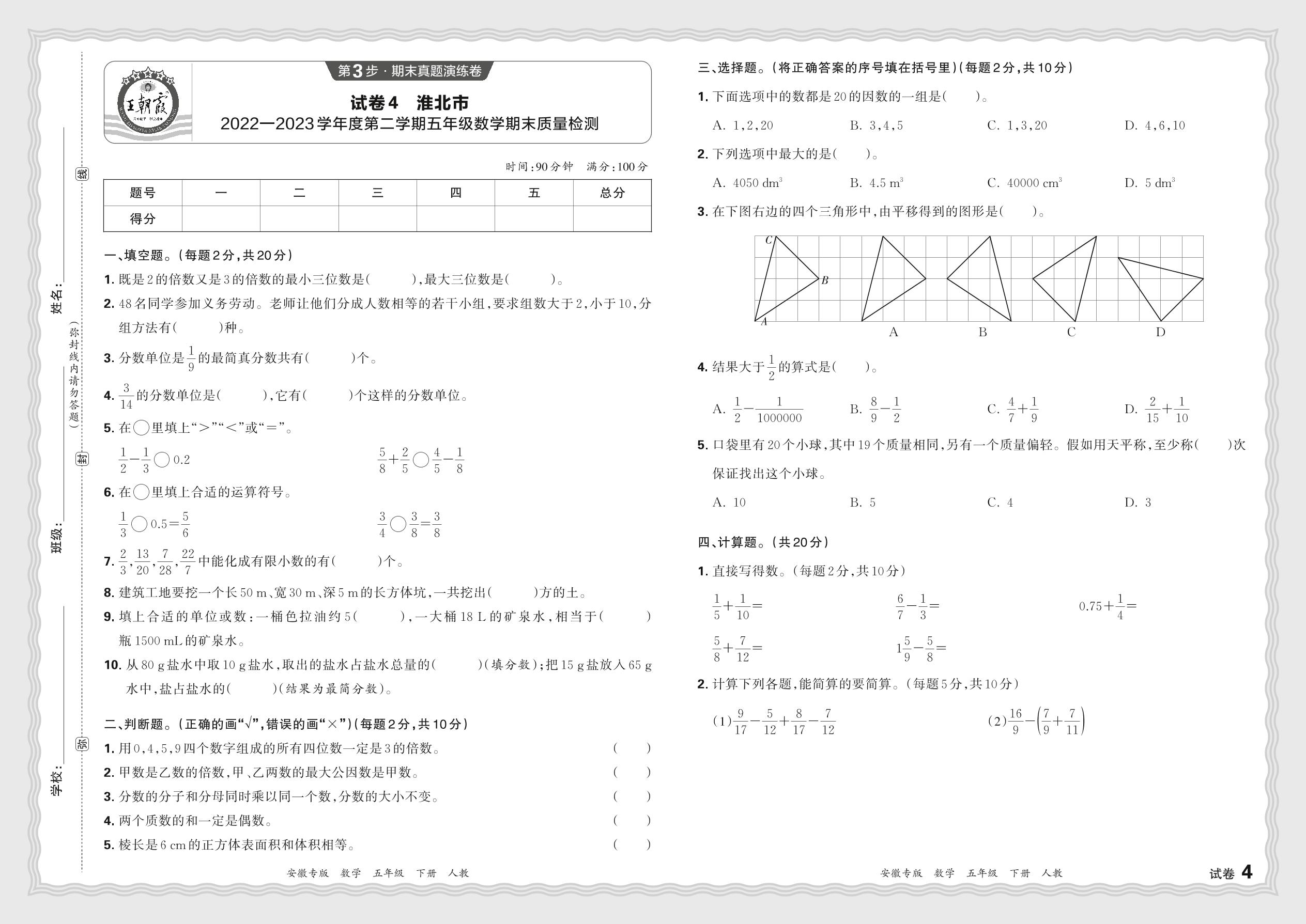 安徽省淮北市2022—2023学年度第二学期五年级数学期末质量检测(人教版)【4】